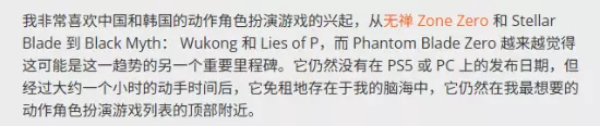 Austin Wood在总评中提到,从《绝区零》、《剑星》到《黑神话悟空》、《匹诺曹的谎言》,中韩动作RPG的崛起令人欣喜,而《影之刃零》正逐渐成为这一浪潮的新里程碑。虽PS5/PC版尚未定档,但短短一小时试玩已让本作深受他的喜爱,稳居最期待动作RPG前列。