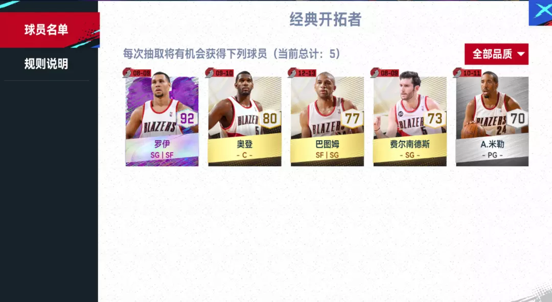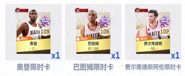 2、【经典开拓者】卡池中的球员(经典紫卡经典紫卡罗伊,经典金卡奥登、巴图姆、费尔南德斯,经典银卡A·米勒),预计将于2025年5月22日10:00上架转会市场。 经典紫卡阿尔德里奇,预计将于2025年5月29日10:00上架转会市场。