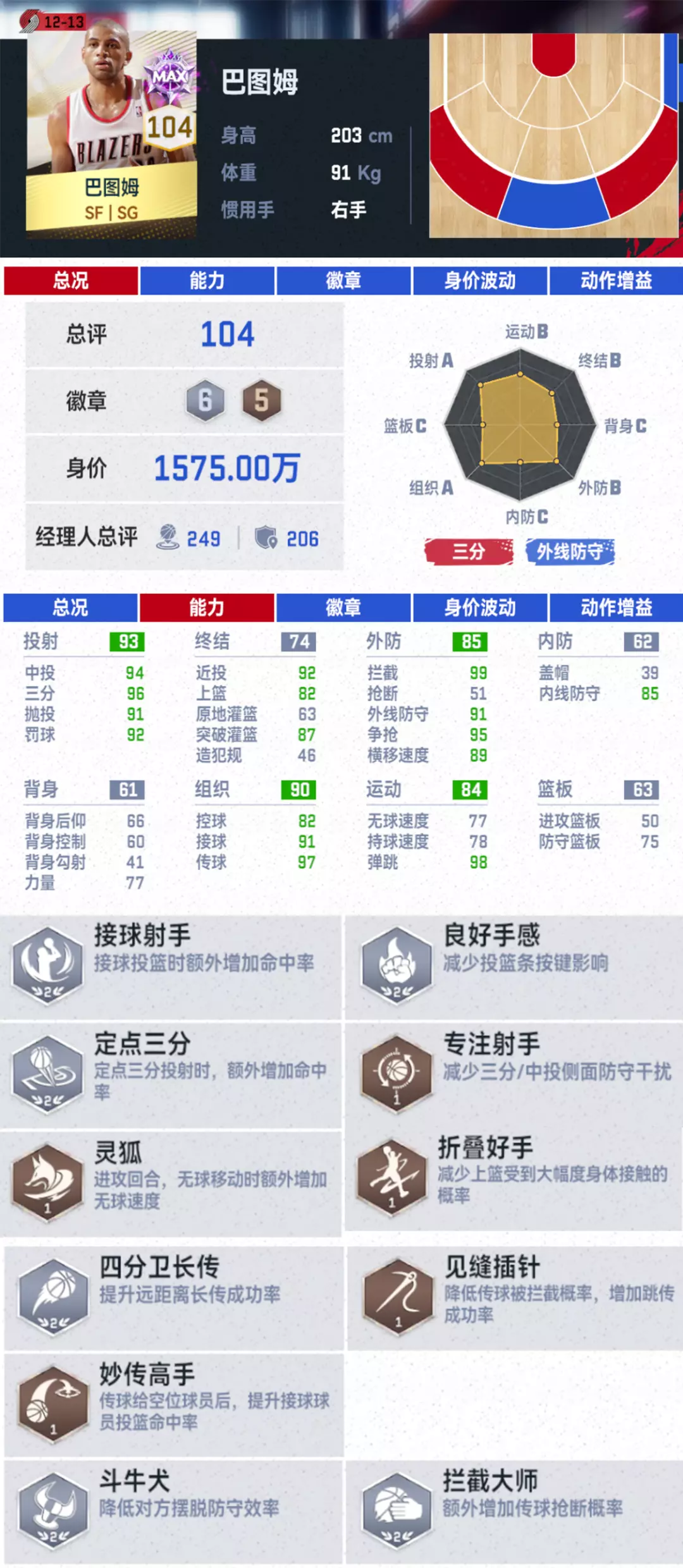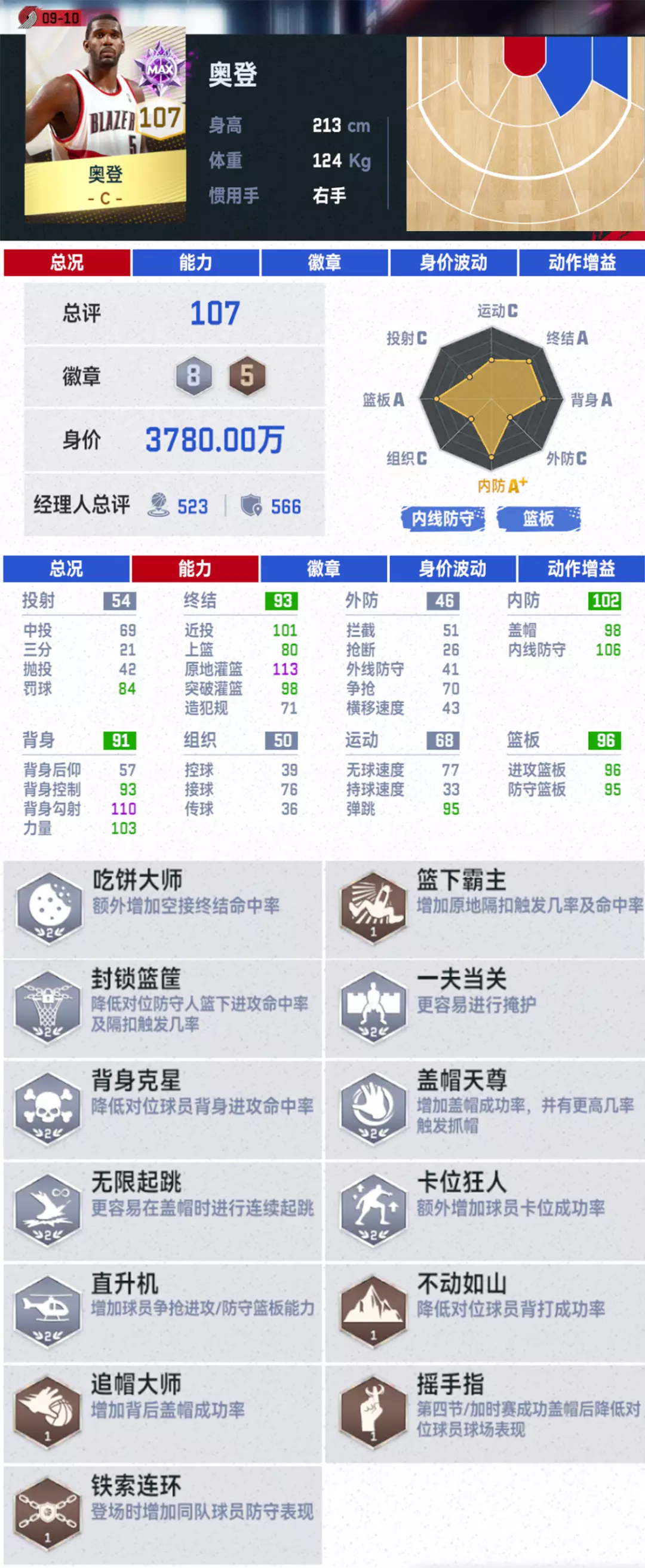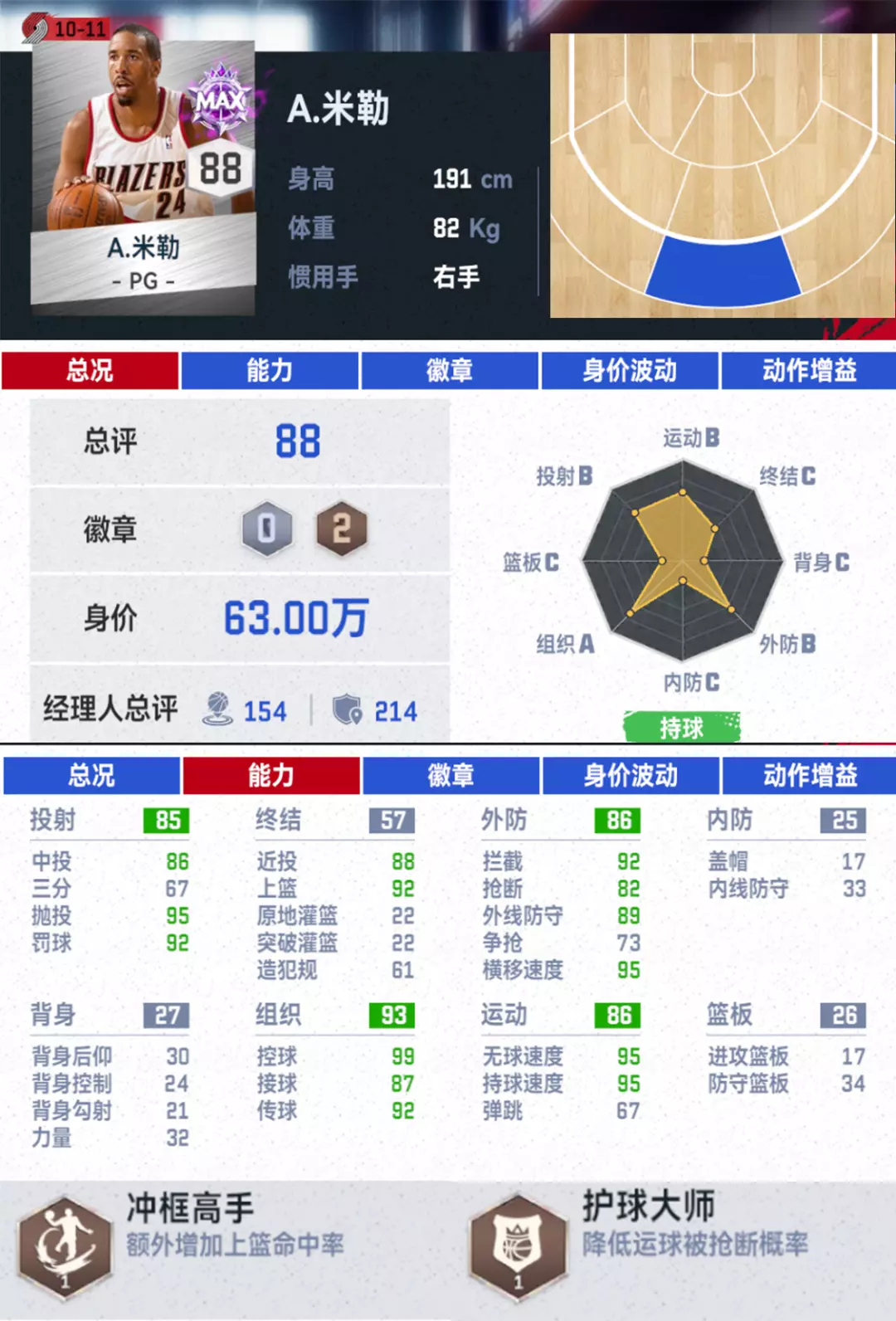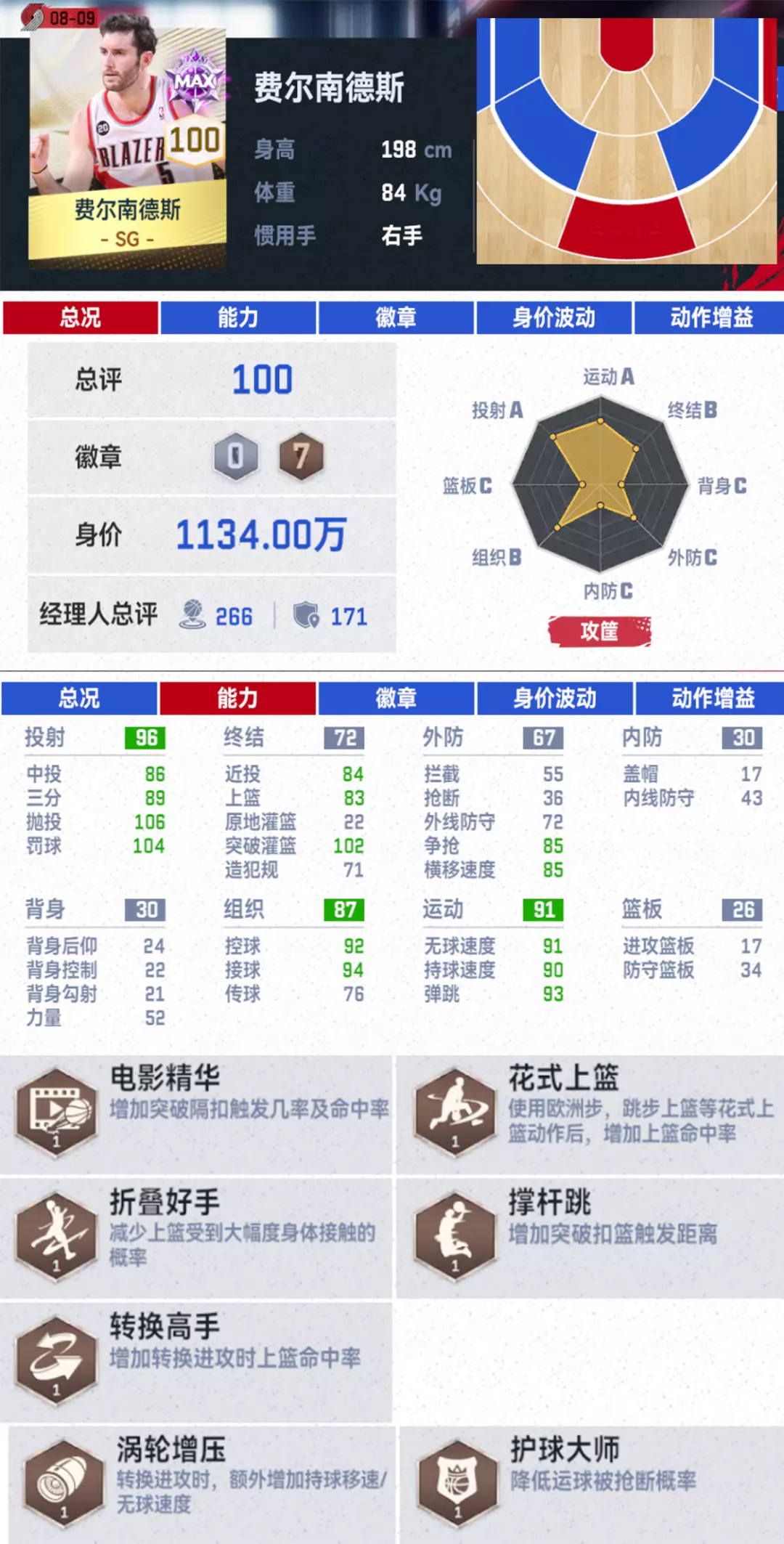 同时罗伊还有着同位置球员中顶尖的攻框能力(满突111突破灌篮属性值),一旦给到罗伊杀入内线的机会,【电影精华】加上【冲框高手】对手大概率会变成罗伊暴扣的背景板!
