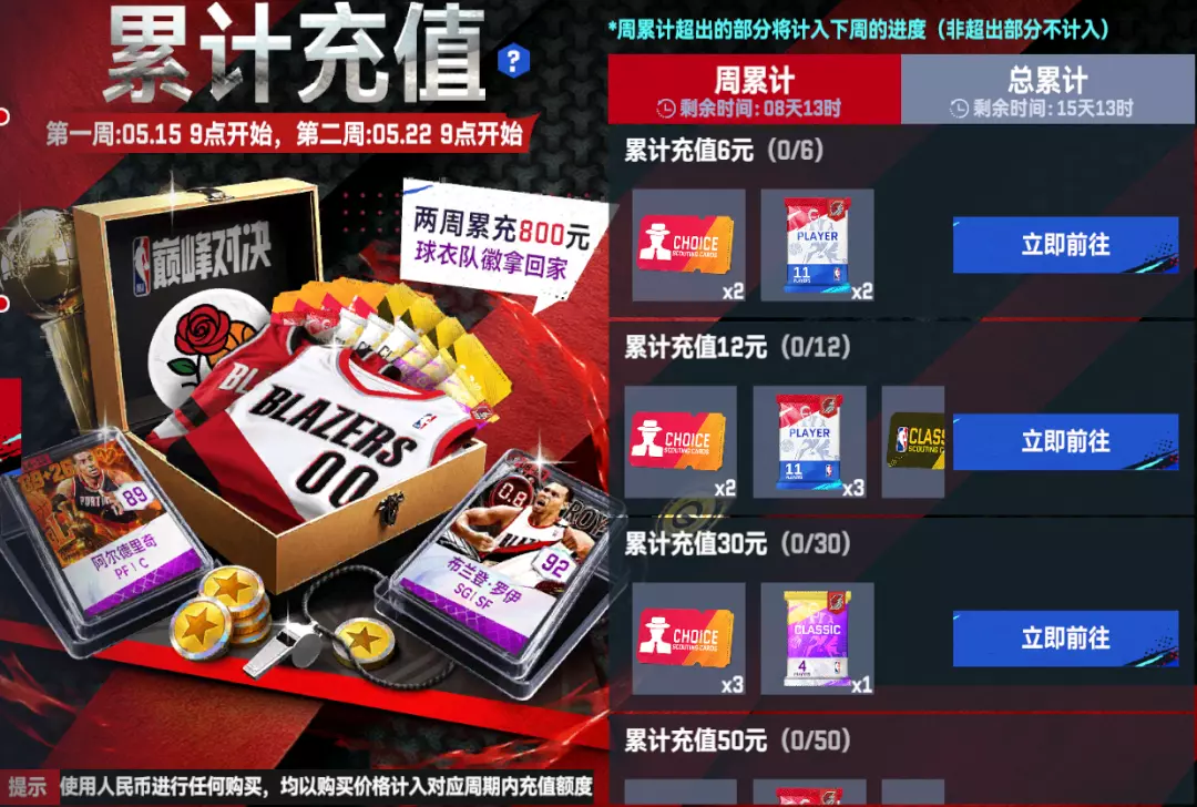 更有限定队徽、经典紫卡罗伊、阿尔德里奇供您选择!两周累充到达800即可获得全新开拓者王朝复古球衣!
