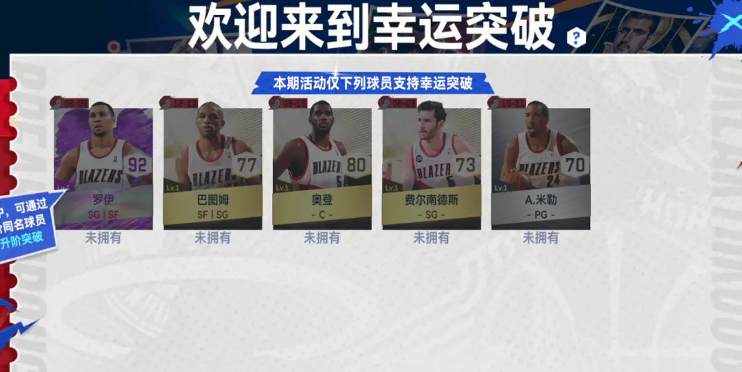 经典开拓者卡池球员限时开启幸运突破!本次幸运突破持续二周,活动期间,您可以通过使用少量球员卡,对应不同概率突破经典开拓者卡池球员阶级。快来幸运一掷,少量球员也能成就高突的感受!