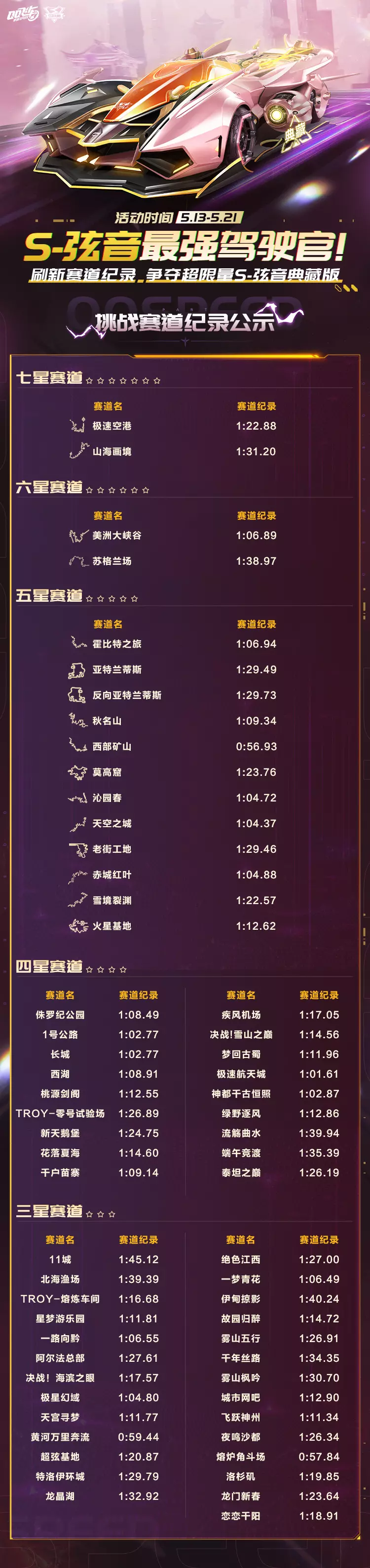 角逐S-弦音最强驾驶官!刷新赛道纪录,争夺超限量S-弦音 典藏版!小橘子也为大家整理了所有挑战赛道的纪录。究竟车手们能将以下赛道成绩提升至怎样的新高度?让我们拭目以待!