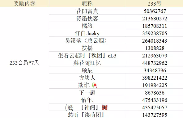 1.随机抽取20位成功参与的玩家赠送233乐园会员7天