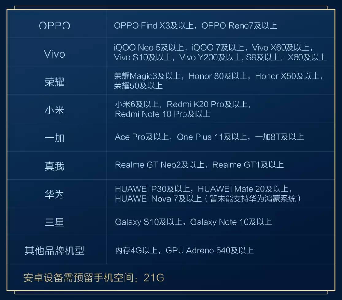 配置要求:为保证良好的游戏体验,本次测试版本将仅支持以下设备,未在列表内的设备将无法参与本次测试。开发团队正在尽全力让更多移动设备玩家能够体验到本作,无法参与本次测试的冒险者也敬请关注后续官方信息。