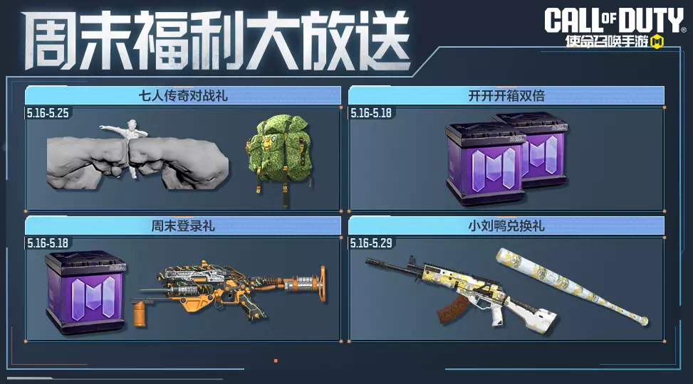 5月16日(本周五)-5月18日(本周日),开开开箱双倍挑战再度来袭。战士们完成每日任务,就能获得双倍开开开箱奖励了哟!