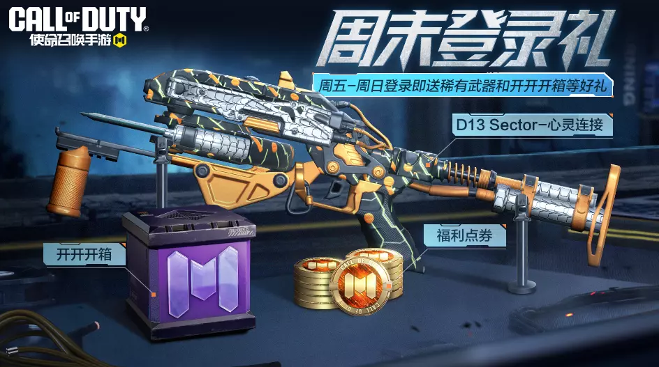 ● 【周末登录礼】正式上线,周末登录游戏,就能获得稀有级武器D13 Sector-心灵连接、开开开箱等好礼;