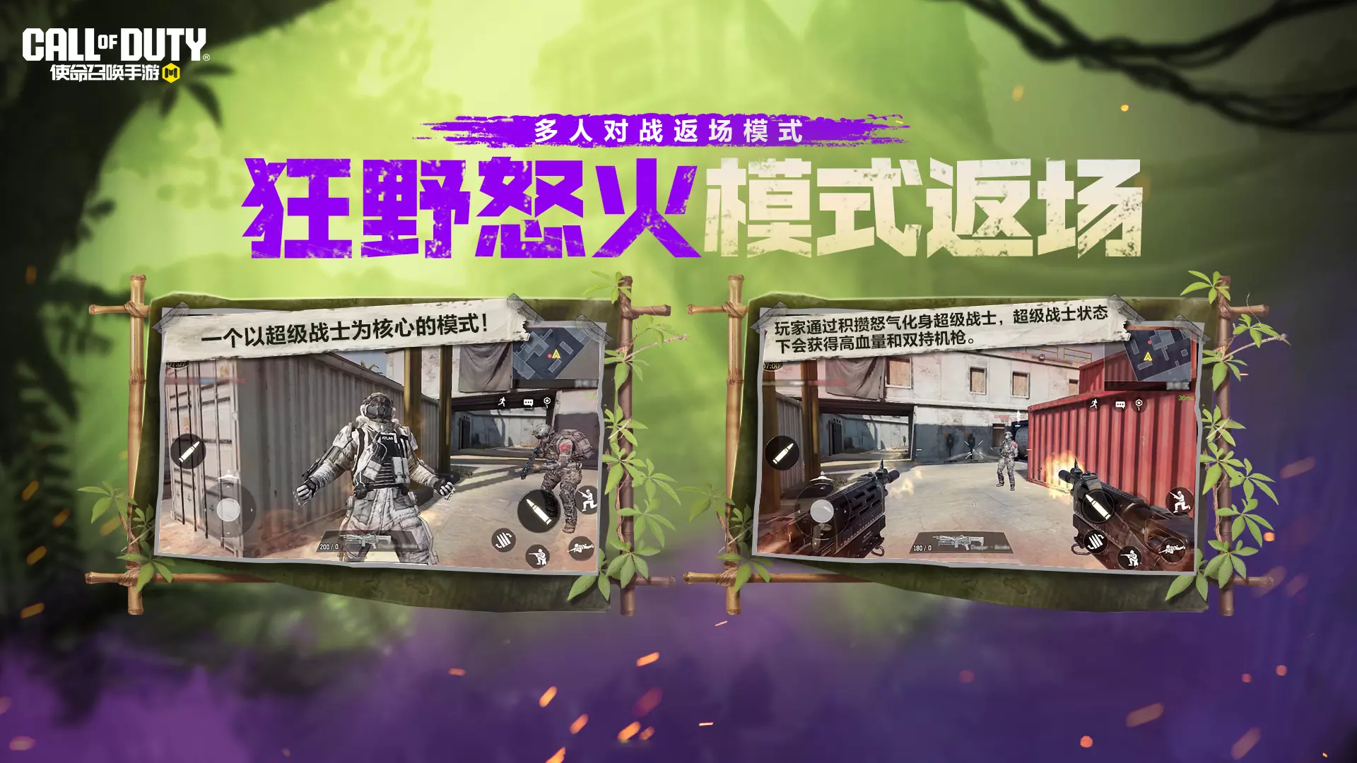 5月14日(明天),多人对战-限时-狂野怒火模式迎来返场。在该模式中,战士们可以通过积攒怒气化身超级战士,获得高血量和双持机枪两大特殊效果。狭路相逢,各自为战,战士们准备好释放自己内心的狂野了吗?