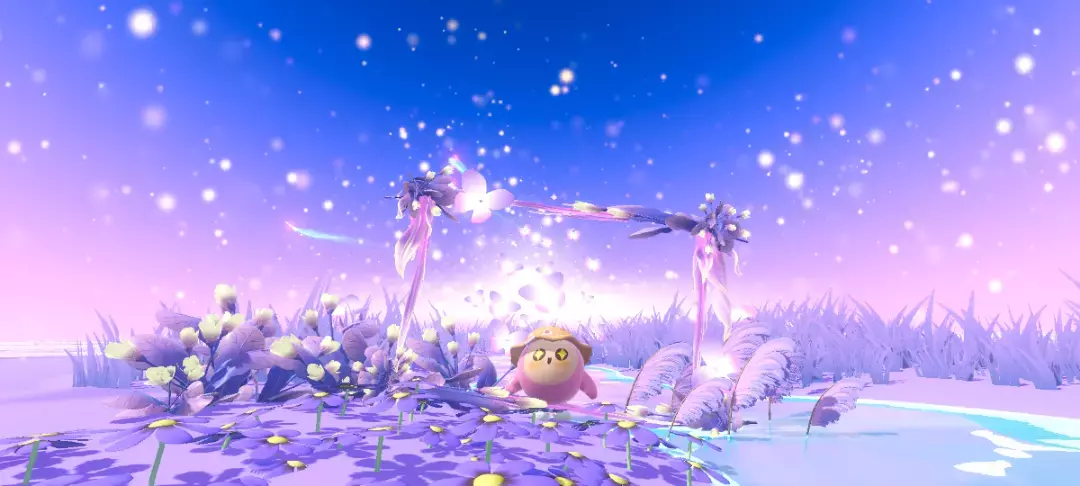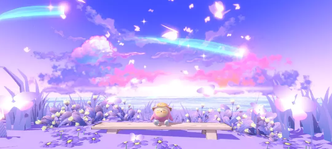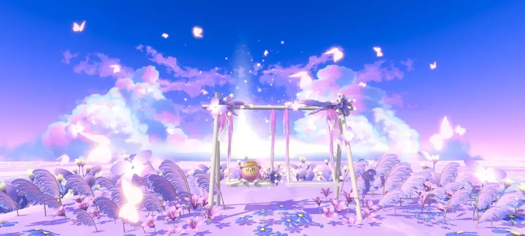这里也是超美的呀,背景的天空是超级灿烂的云霞,蓝紫配色很高级呀,背景还有超级多的发光小蝴蝶,真的好美好梦幻呀~
