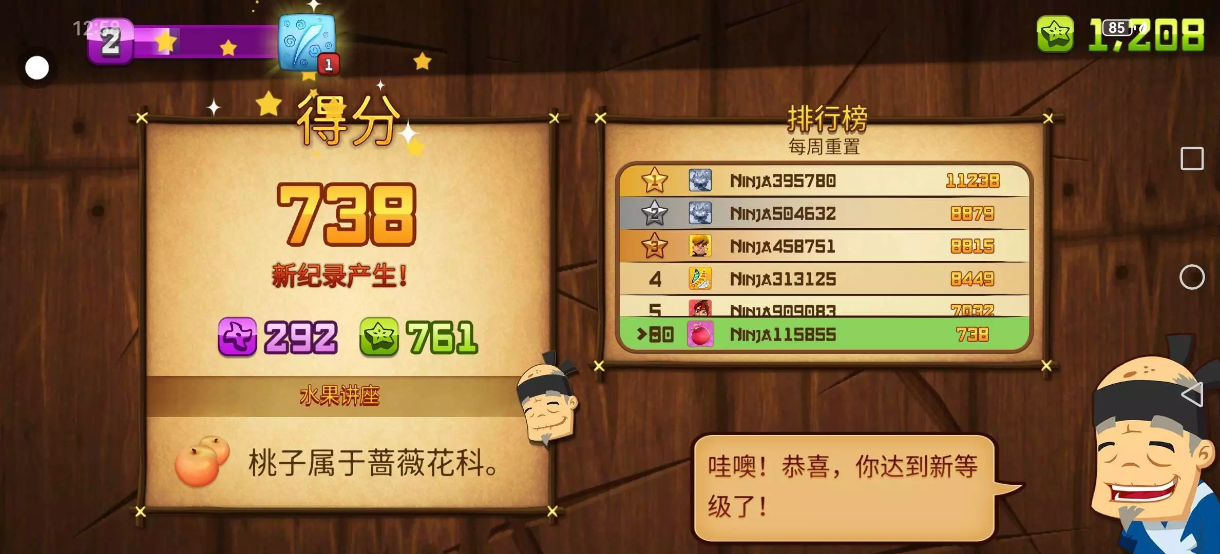水果忍者老玩家了,很早之前玩了,现在想重新叙叙旧,打的第1把就这个战绩我觉得还可以(没有任何特效刀)