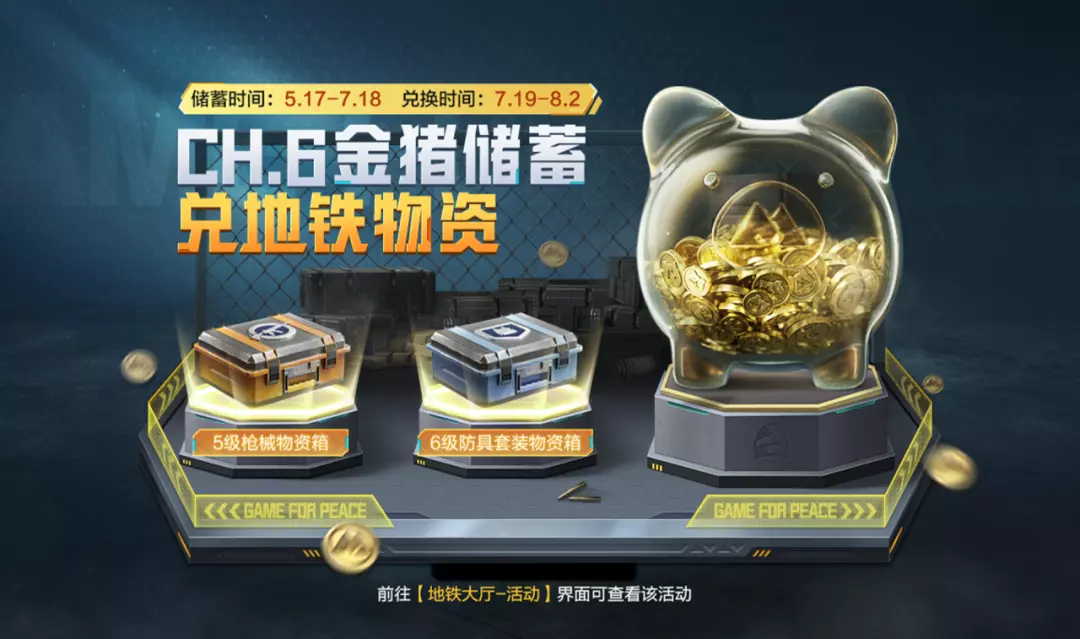 7月19日CH.7赛季开启后,可在活动界面消耗金猪币兑换5级枪械物资箱、6级防具套装物资箱等地铁物资奖励!