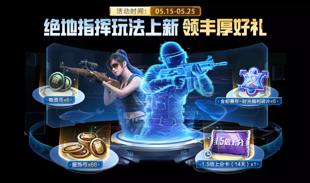 5月15日-5月25日,完成指定任务获得指挥卡以及查看玩法介绍,即可获得1.5倍上分卡(14天)×1,服饰币×66,物资币×6,时光福利碎片×6。