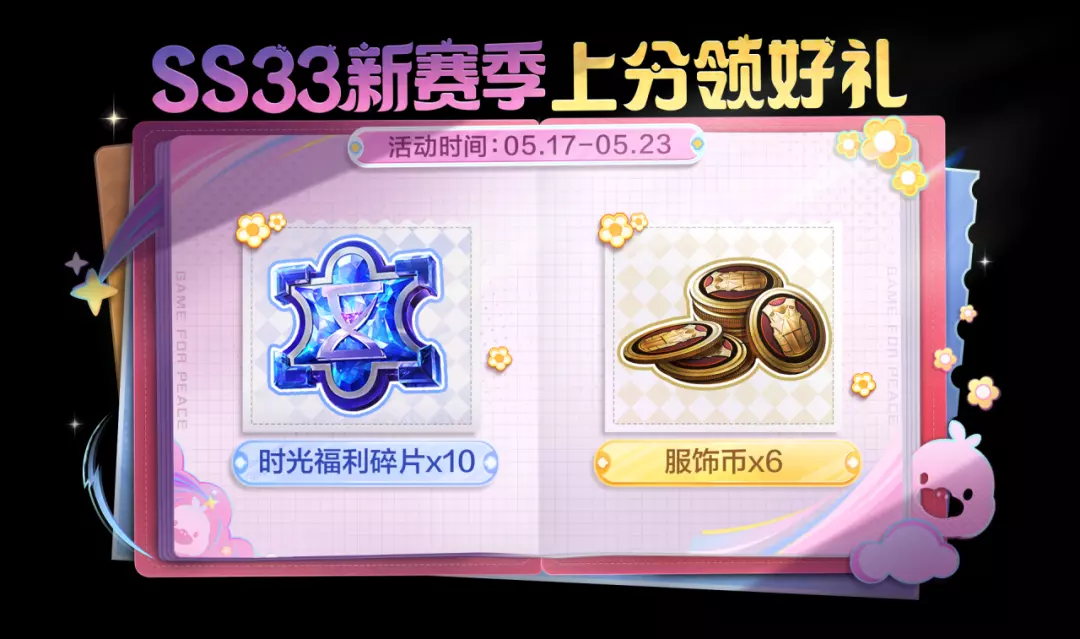 5月17日-5月23日,SS33新赛季开启,上分累计达到指定的分数,可领取时光福利碎片x10,查看上赛季回顾送6个服饰币哟