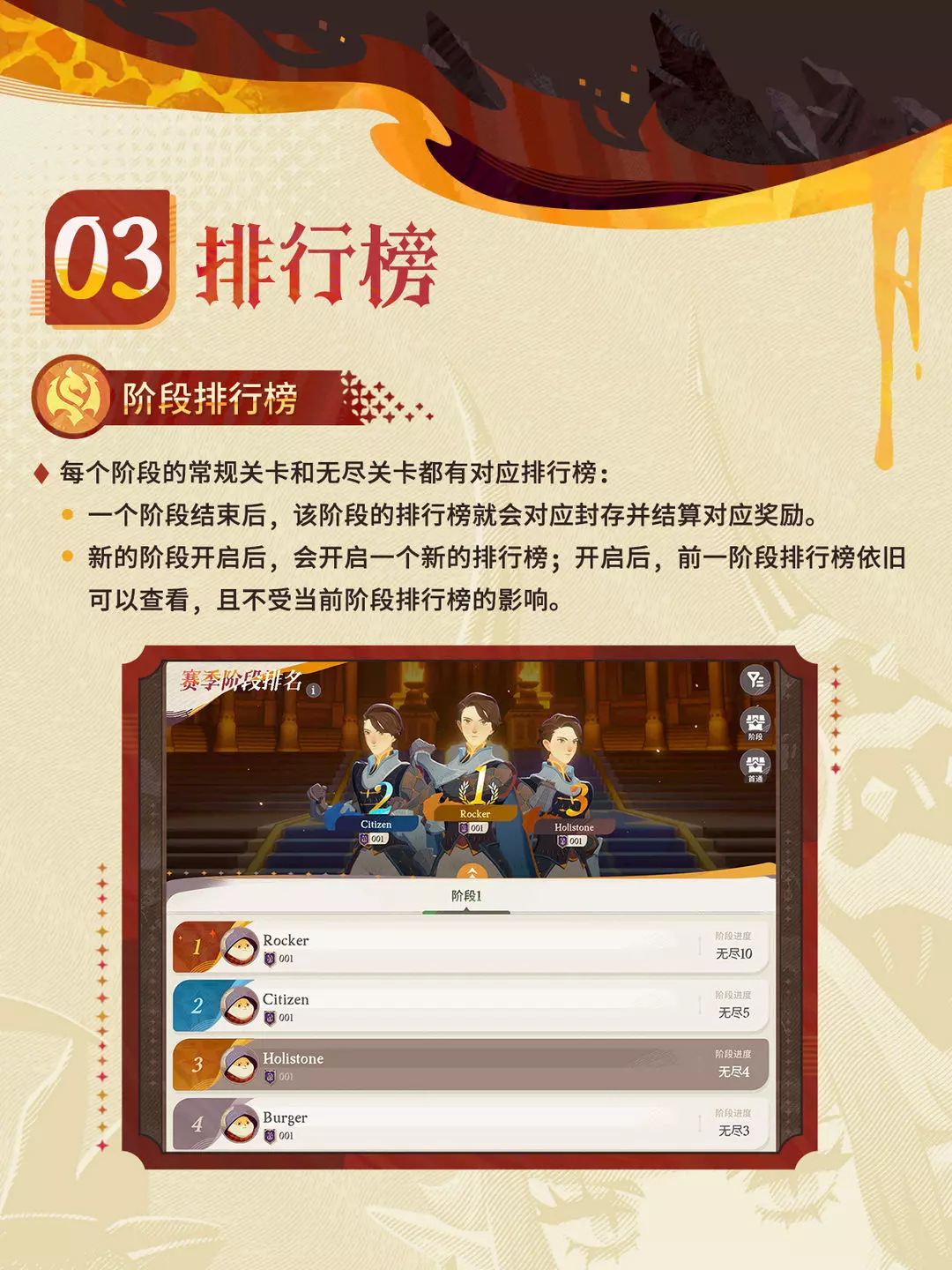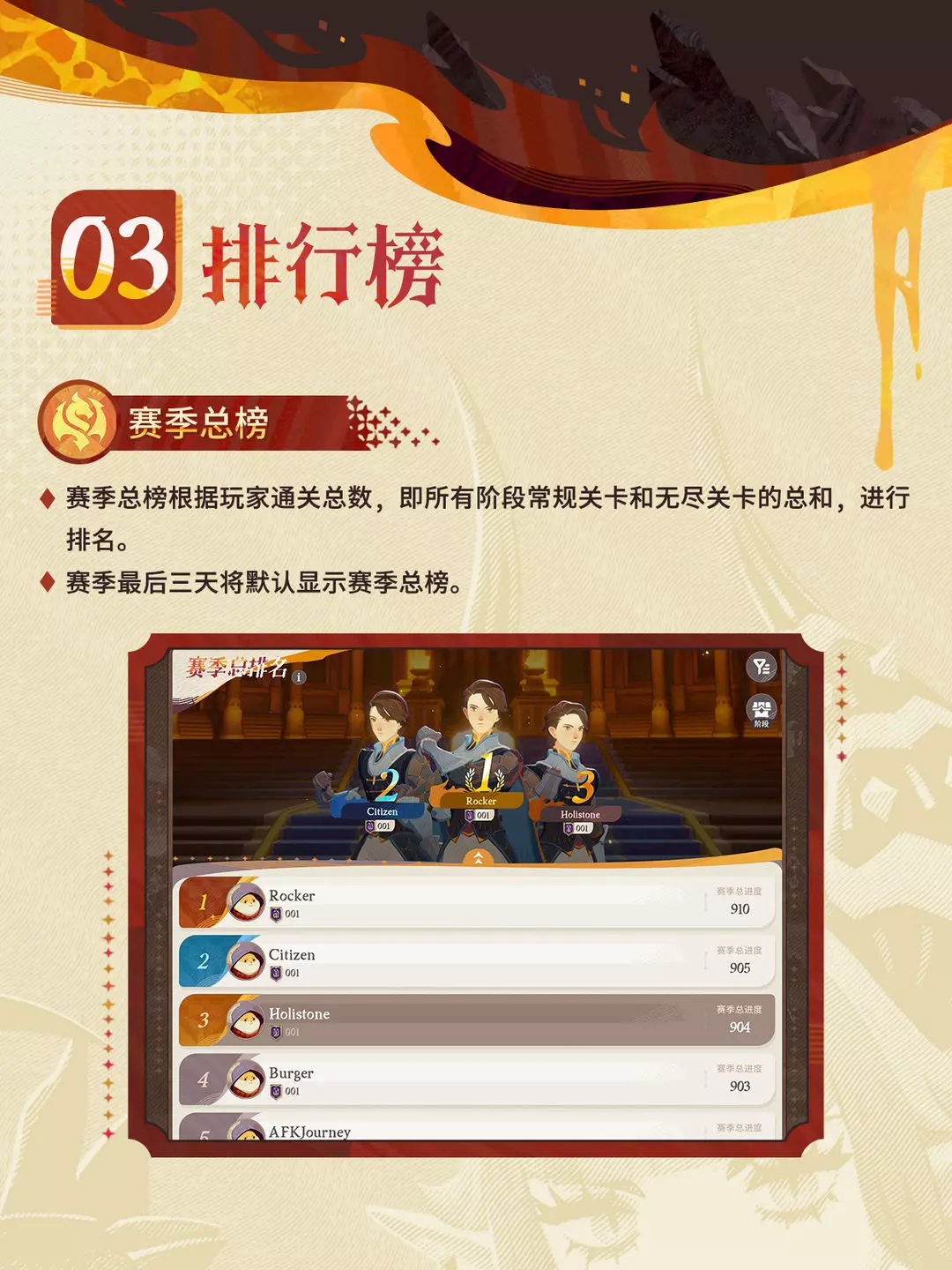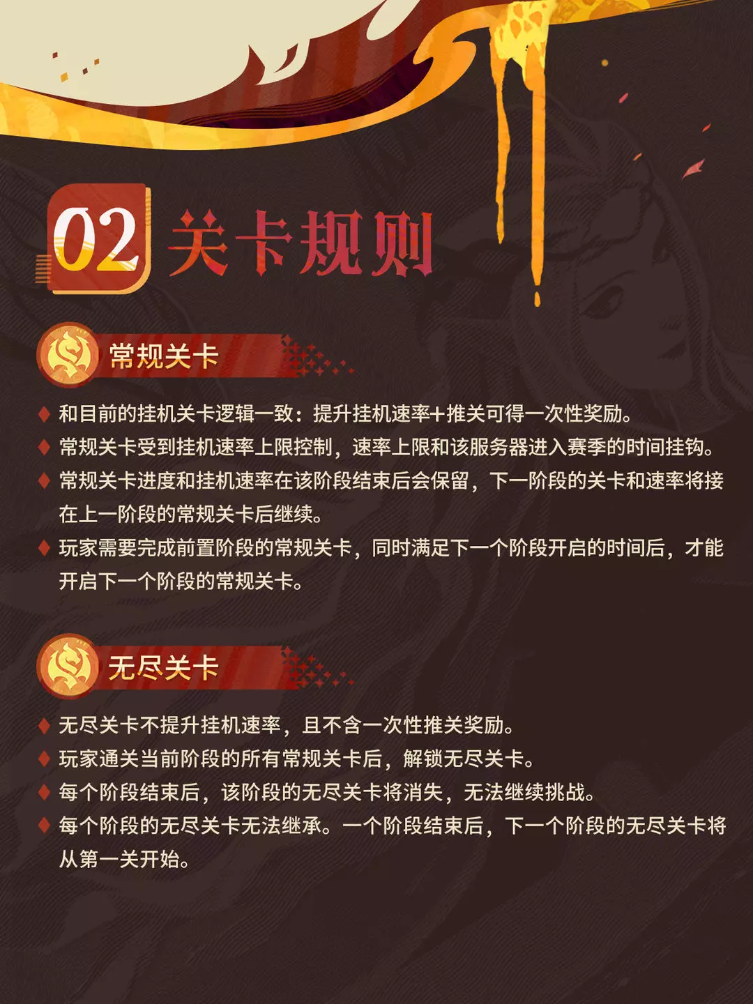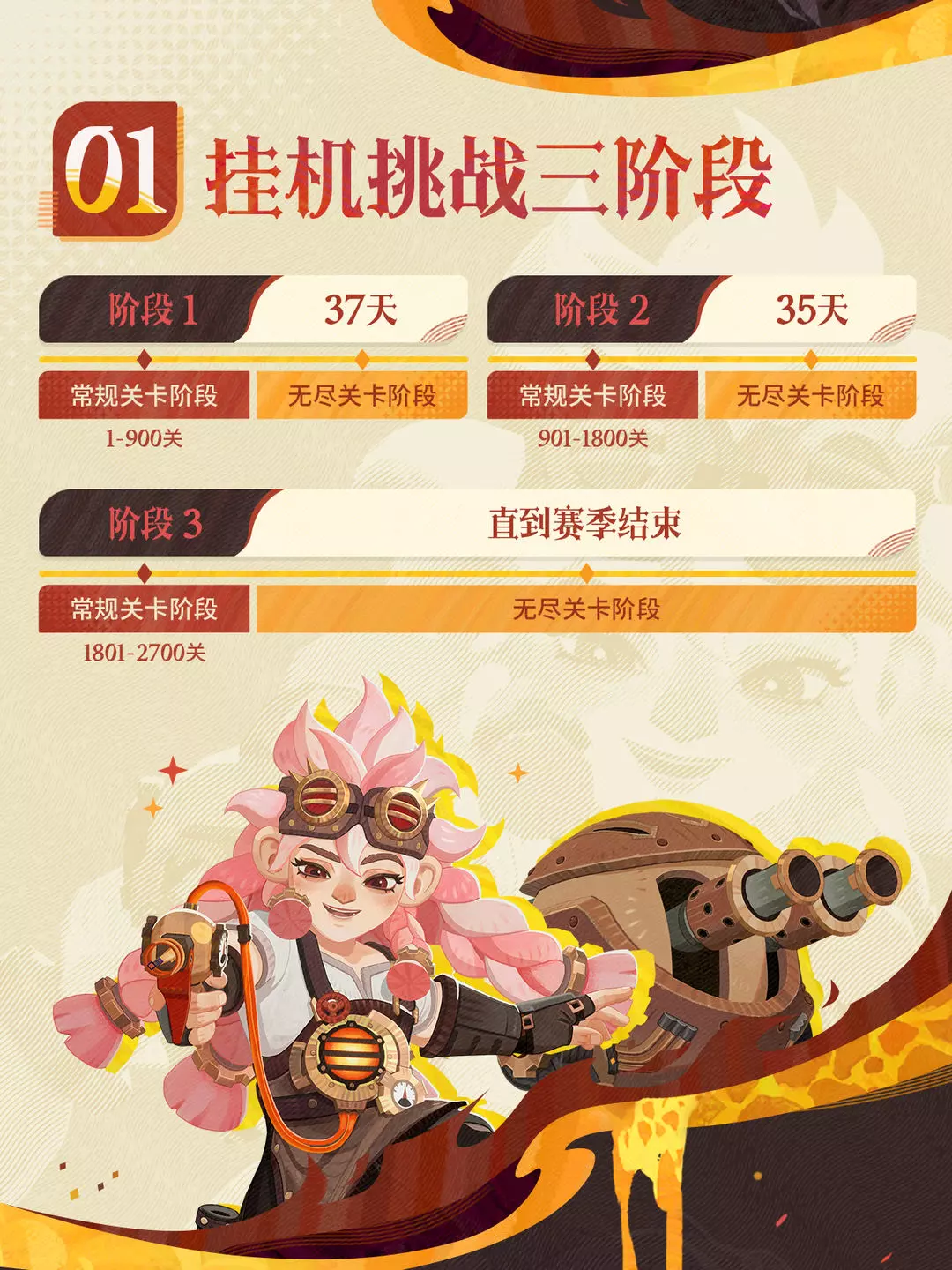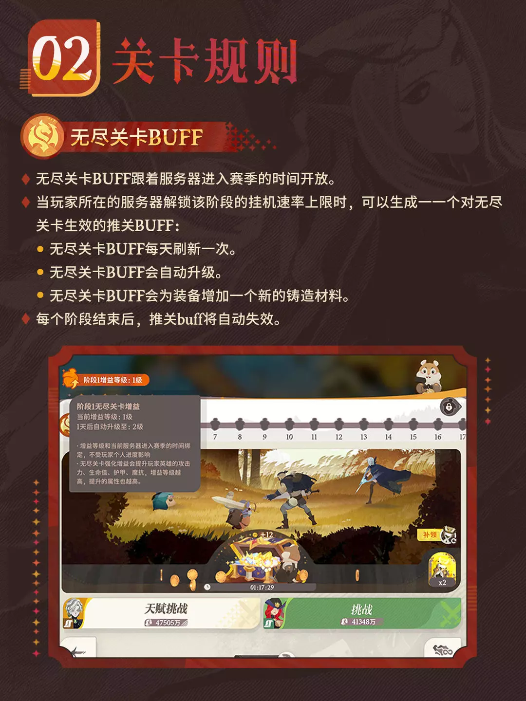 赛季挂机挑战将分为3阶段进行,当挂机关卡达到阶段上限后,玩家可参加阶段专属的无尽推关活动。