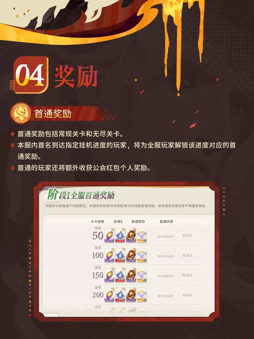 本服内首名到达指定挂机进度的玩家,将为全服玩家解锁该进度对应的首通奖励!