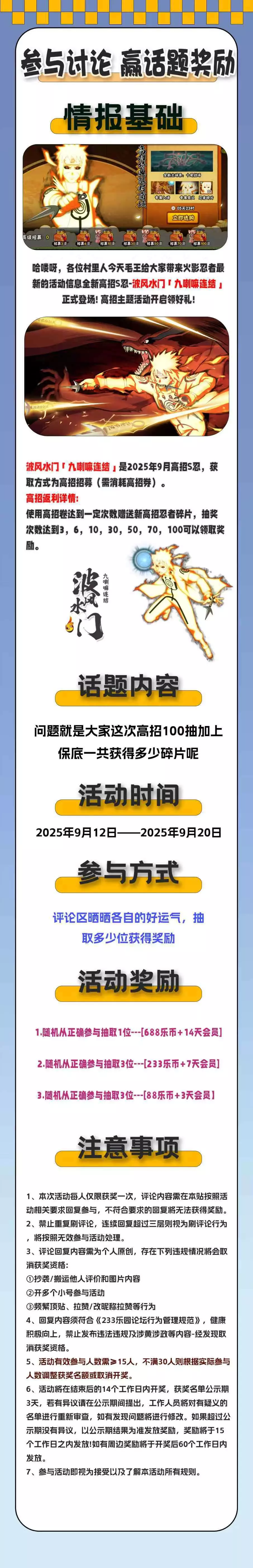 在评论区说一说自己使用自来也时打出的连招或者自来也使用小技巧即可成功参与互动!