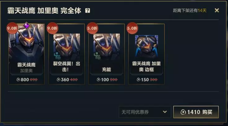不仅如此,即日起,截止至5月29日23:59,召唤师还可以1410点券的优惠价格购入霸天战鹰 加里奥 完全体礼包,礼包内包含9折优惠的霸天战鹰 加里奥皮肤和全新精英姿态-裂空战翼!出击!,更有5折优惠的姿态-充能和皮肤边框-霸天战鹰 加里奥。