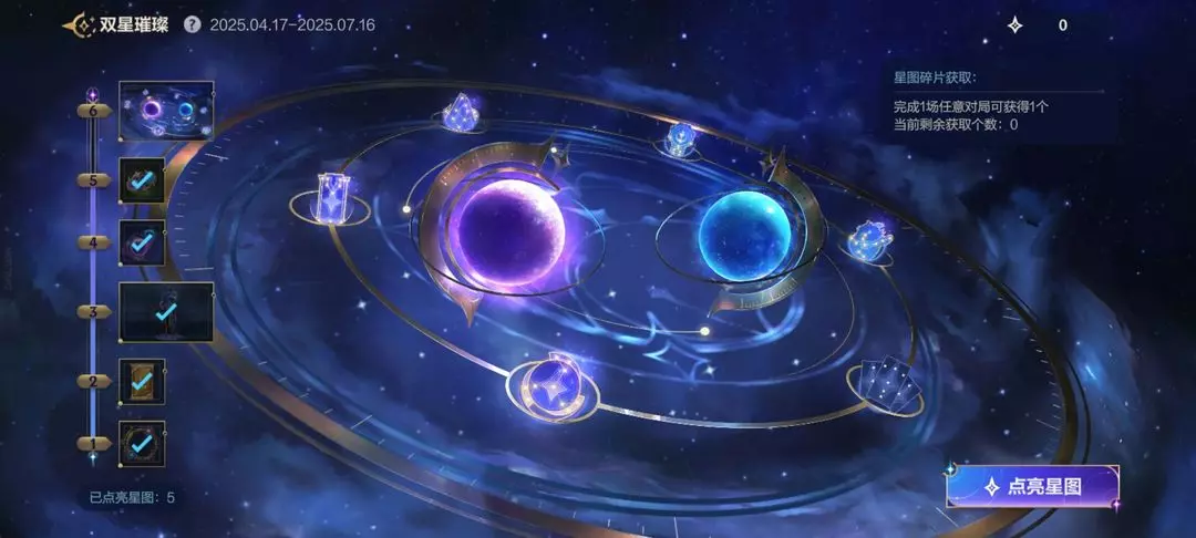 每张星图完全点亮需消耗10个星图碎片,只有在星图完全被点亮后,才可解锁专属奖励。建议召唤师在完全点亮单个星图后,再去点亮下一个星图,可以更早获得奖励哦!奖励仅在“双星璀璨”版本主题期内领取,大家记得及时领取~