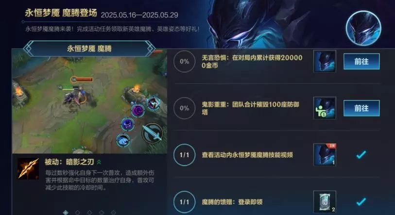 永恒梦魇 魔腾来袭!即日起,截止至5月29日,召唤师完成活动任务即可领取新英雄永恒梦魇 魔腾、英雄姿态、传奇图集三星卡包(蓝)等好礼!
