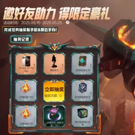 即日起,截止至5月25日23:59,召唤师邀请指定好友登录助力,即可抽取全新iPhone 16 Pro max手机和随机周边手办!完成任务更有精选头像随机宝箱等你来领~