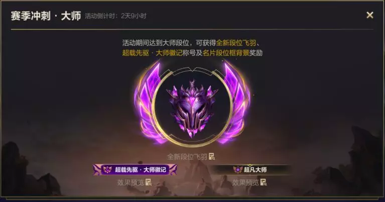 赛季初冲刺专属奖励倒计时3天!截止至5月18日23:59,召唤师达到超凡大师段位即可获得全新段位飞羽、称号-超载先驱·大师徽记及名片段位框背景奖励~