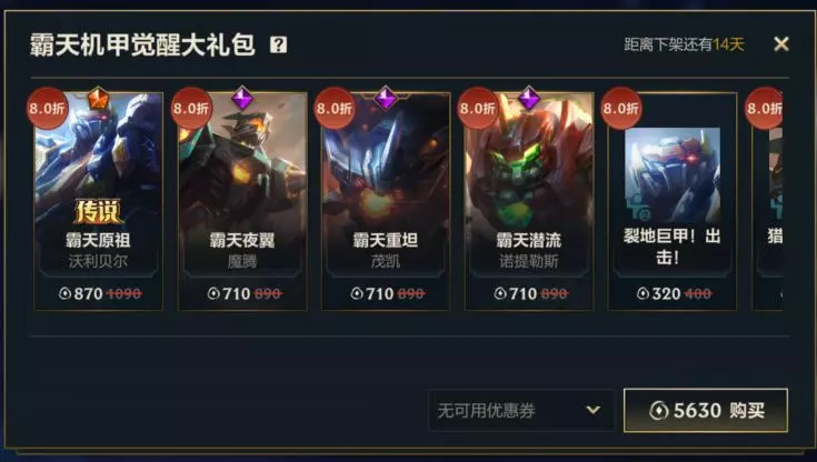 即日起,截止至5月29日23:59,召唤师可前往商城,使用5630点券获取霸天机甲觉醒大礼包!礼包内包含8折优惠的传说皮肤-霸天原祖 沃利贝尔、霸天潜流 诺提勒斯、霸天重坦 茂凯、霸天夜翼 魔腾共4款新皮肤以及对应皮肤精英姿态,此外,还包含对应皮肤姿态、皮肤边框和回城特效等5折好礼~