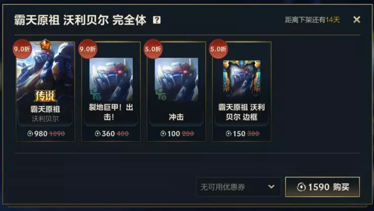 即日起,截止至5月29日23:59,召唤师可以1590点券的优惠价格购入霸天原祖 沃利贝尔完全体礼包,礼包内包含9折优惠的传说皮肤-霸天原祖 沃利贝尔和精英姿态-裂地巨甲!出击!,更有5折优惠的姿态-冲击和皮肤边框-霸天原祖 沃利贝尔。