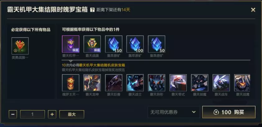 除此之外,霸天机甲大集结限时魄罗宝箱也在同步热卖中!即日起,截止至5月29日23:59,召唤师使用100点券开启宝箱,即可获得英勇战旗-金牛战旗(1天),还有机会获得霸天机甲大集结随机皮肤宝箱、英勇战旗-霸天战旗和集萃原矿好礼~