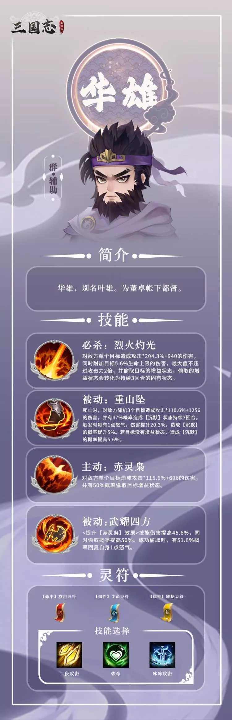 由于华雄的作用,副输出,可以控制,偷BUFF,驱散,所以在灵符的选择上,优先选择【防御灵符】、【生命灵符】、【敏捷灵符】。