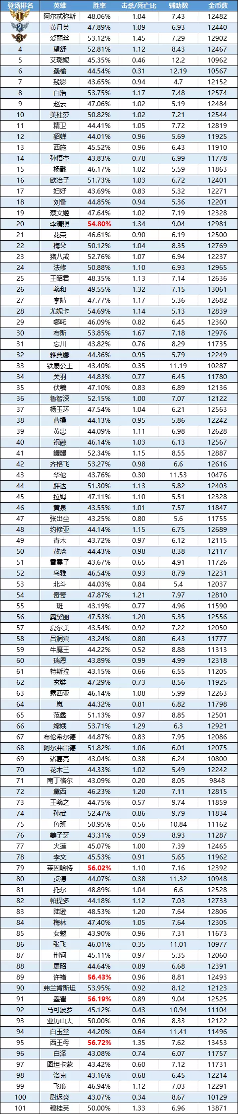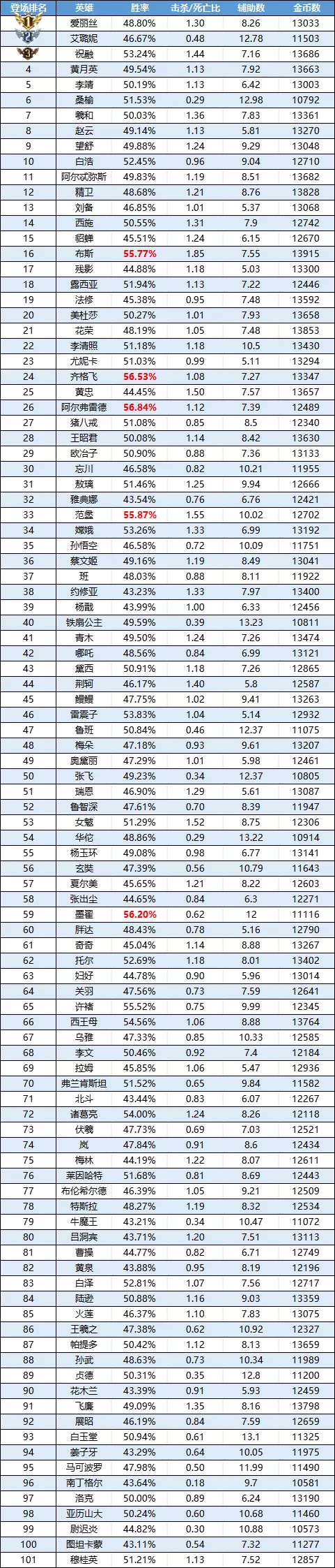排序:按登场率高低排序,标红为胜率前5