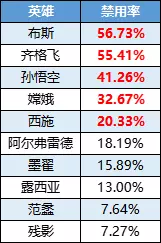 【ban榜】布斯、齐格飞垄断ban位,孙悟空时代已成过去式,阿尔弗雷德禁用率持续攀升。