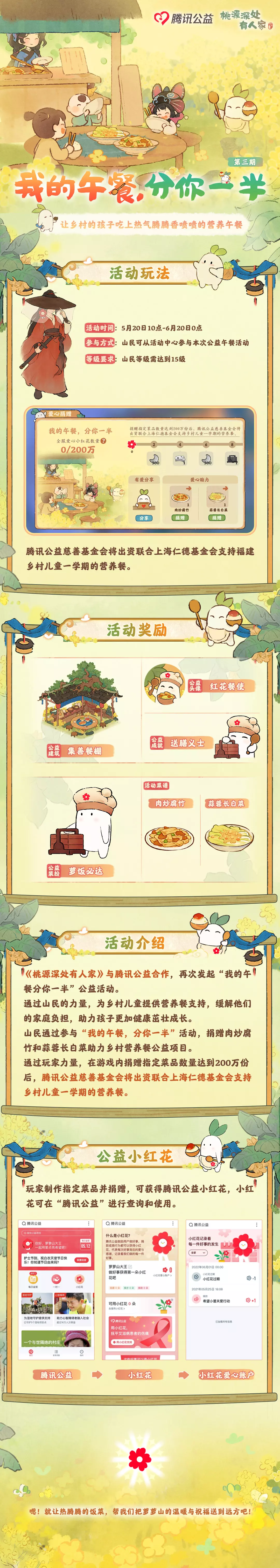 5月20日起,山民可以在游戏内每日捐赠“肉炒腐竹”和“蒜蓉长白菜”获得小红花,当小红花积累到一定数量还能获得游戏内公益限定建筑、装扮以及头像等奖励。