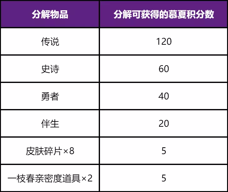 10、分解规则:在祈愿盒中,选中要分解的奖励,点击分解即可把对应奖励分解成慕夏积分。分解规则如下: