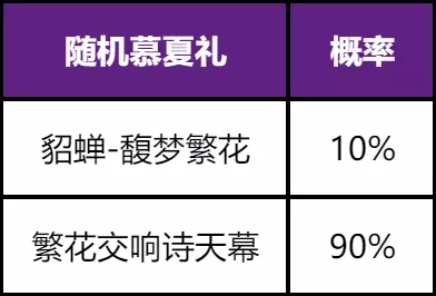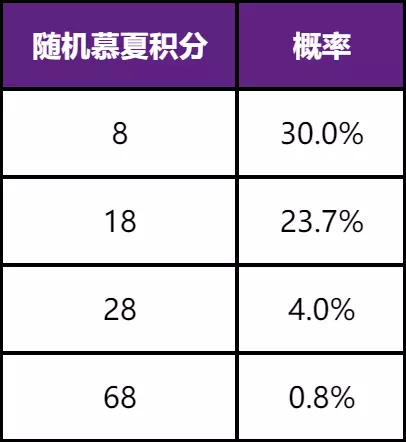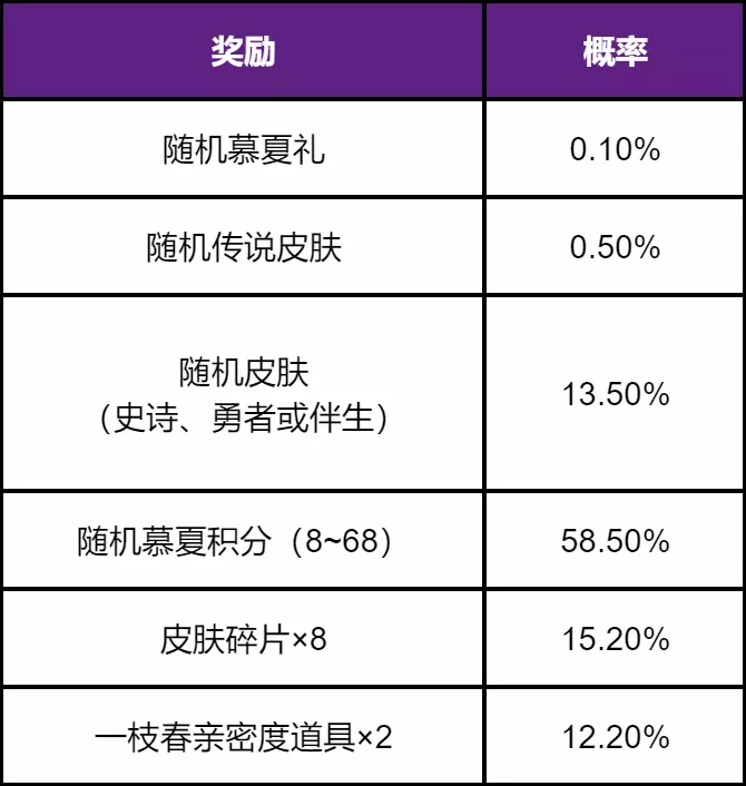 其中,随机慕夏礼、随机皮肤、随机慕夏积分的奖励概率分布如下: