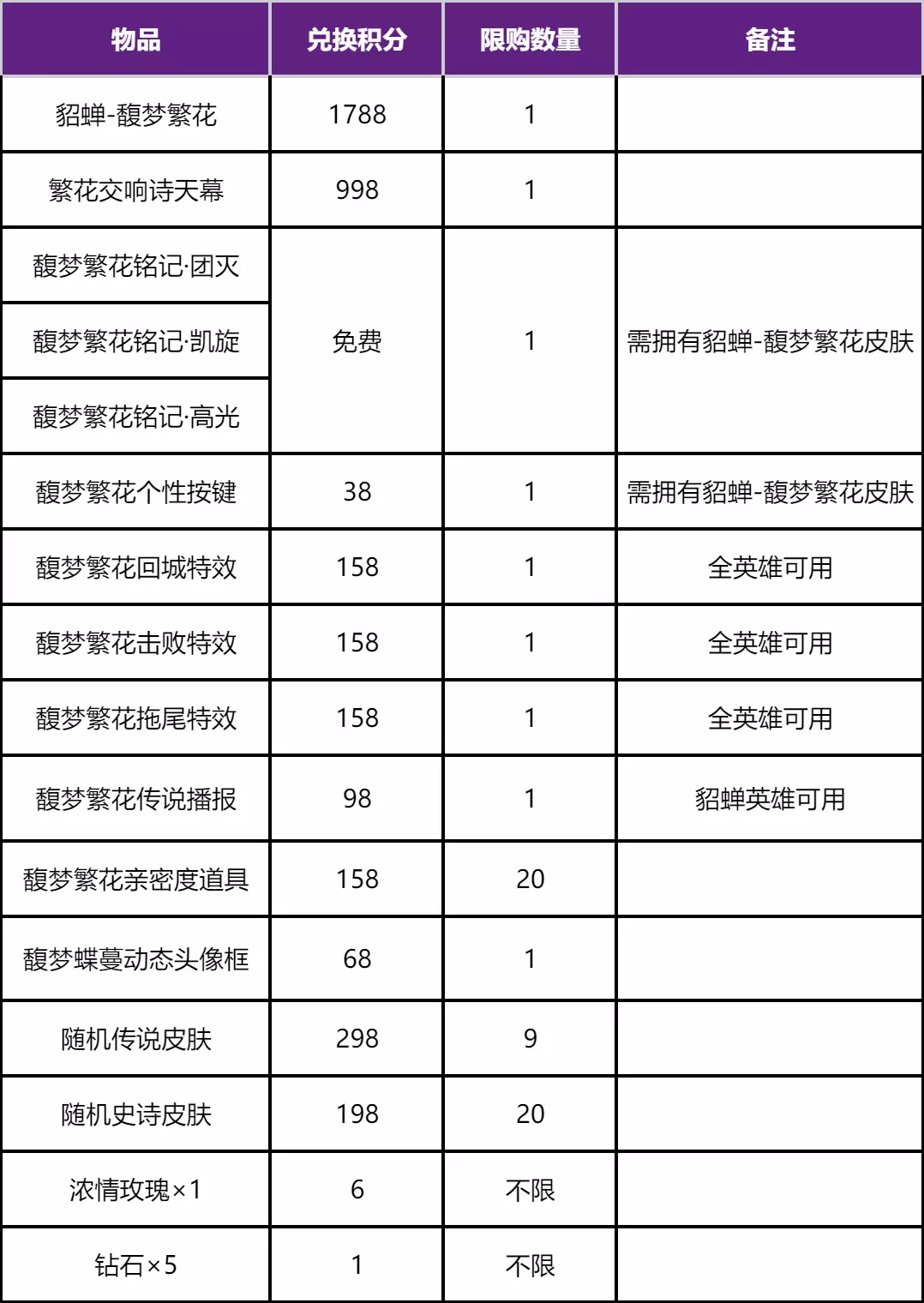 5、慕夏积分:可用于在兑换商店兑换貂蝉-馥梦繁花、繁花交响诗天幕、随机传说皮肤等奖励;通过每日福利、抽奖、在祈愿盒分解皮肤或道具,或获得已有皮肤转化等途径获取。