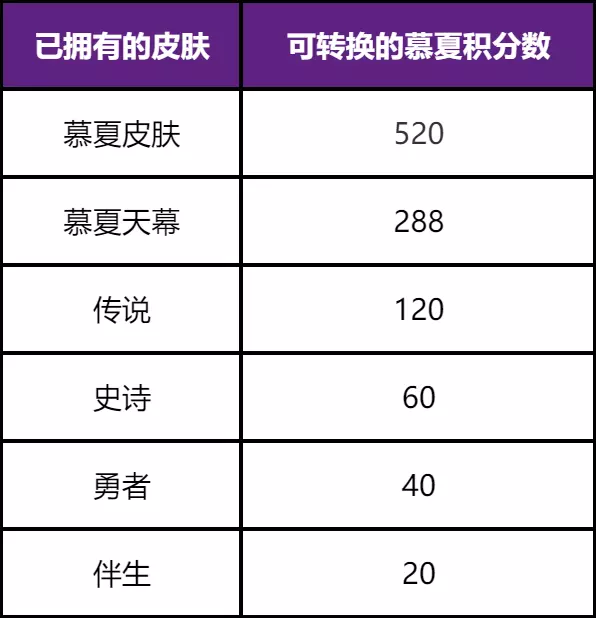 7、重复获得转化:抽取或领取到已拥有的皮肤将转化成一定数量的慕夏积分(抽奖过程、领取皮肤宝箱、兑换随机传说皮肤宝箱、随机史诗皮肤宝箱过程中均可能获得已拥有皮肤)。转化规则如下: