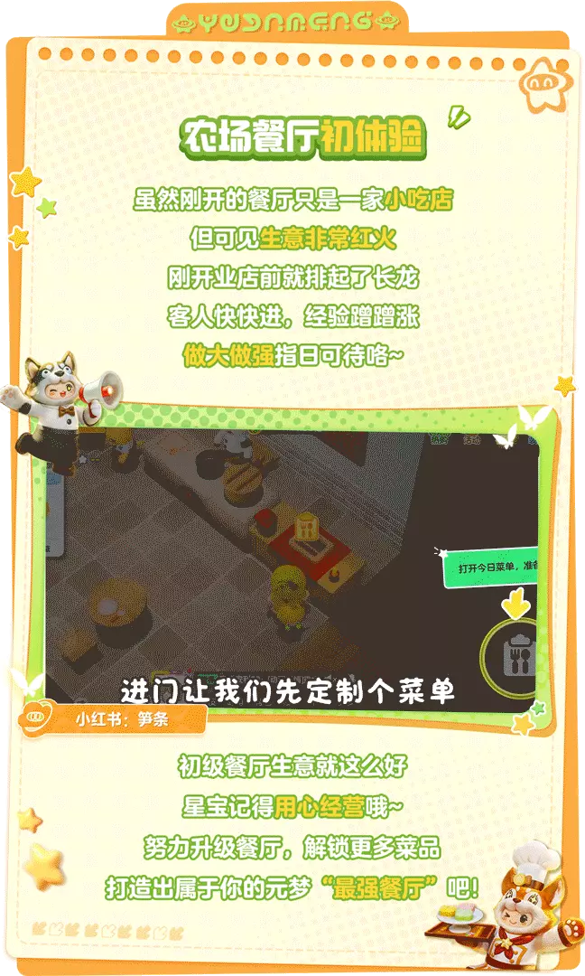 看过星宝们的餐厅奇遇,你的“事业心”是不是也蠢蠢欲动了?今日农场餐厅正式上线!农场80级以上的星宝都可以速速开张咯~