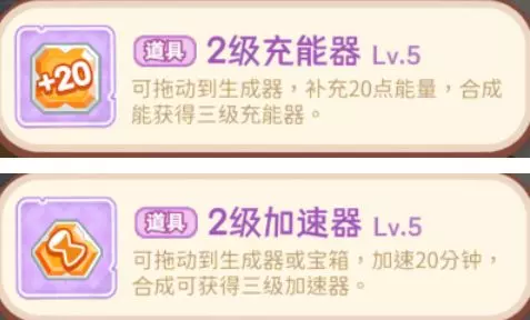对合成器使用的有充能器、加速器等道具,能回复合成器能量以及加速合成器生成速度;
