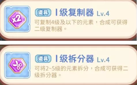 对合成要素使用的则是有复制器、拆分器等道具,能直接复制该合成元素或者是使其拆分成两个下级元素。