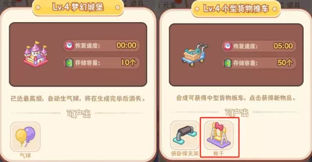 顺带一提,有部分合成器是需要利用其他合成器所生成的合成要素最终合成而来的,比如“梦幻城堡”合成器就需要使用“小型货物推车”所生成的“秋千”合成而来。