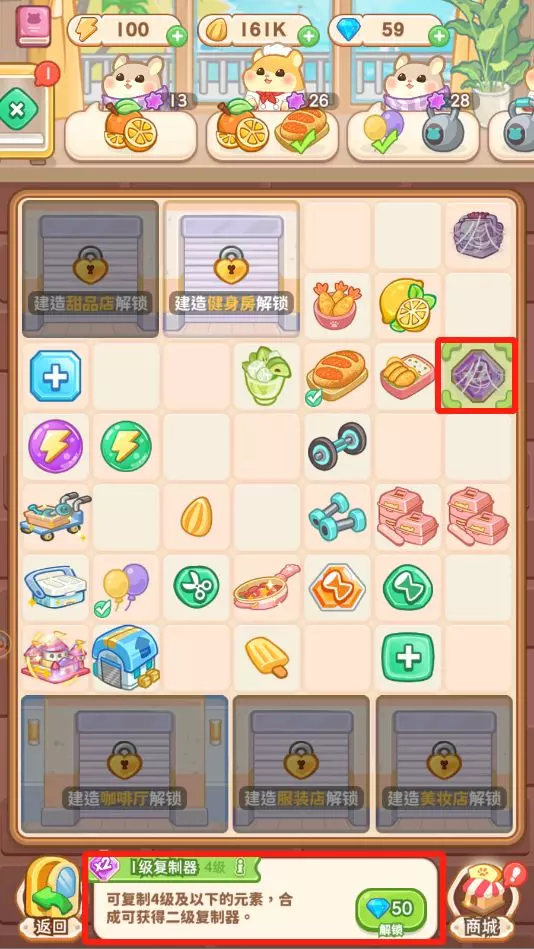 研发中心的棋盘区域会随着各位店长达成棋盘上显示的店铺解锁而逐步扩大,最终达到7x9的规模大小,而未解锁的道具所占据的格子则是可以通过利用相同道具合成或者是花费钻石(不推荐)的方式进行解锁,各位店长可以留意一下哦~