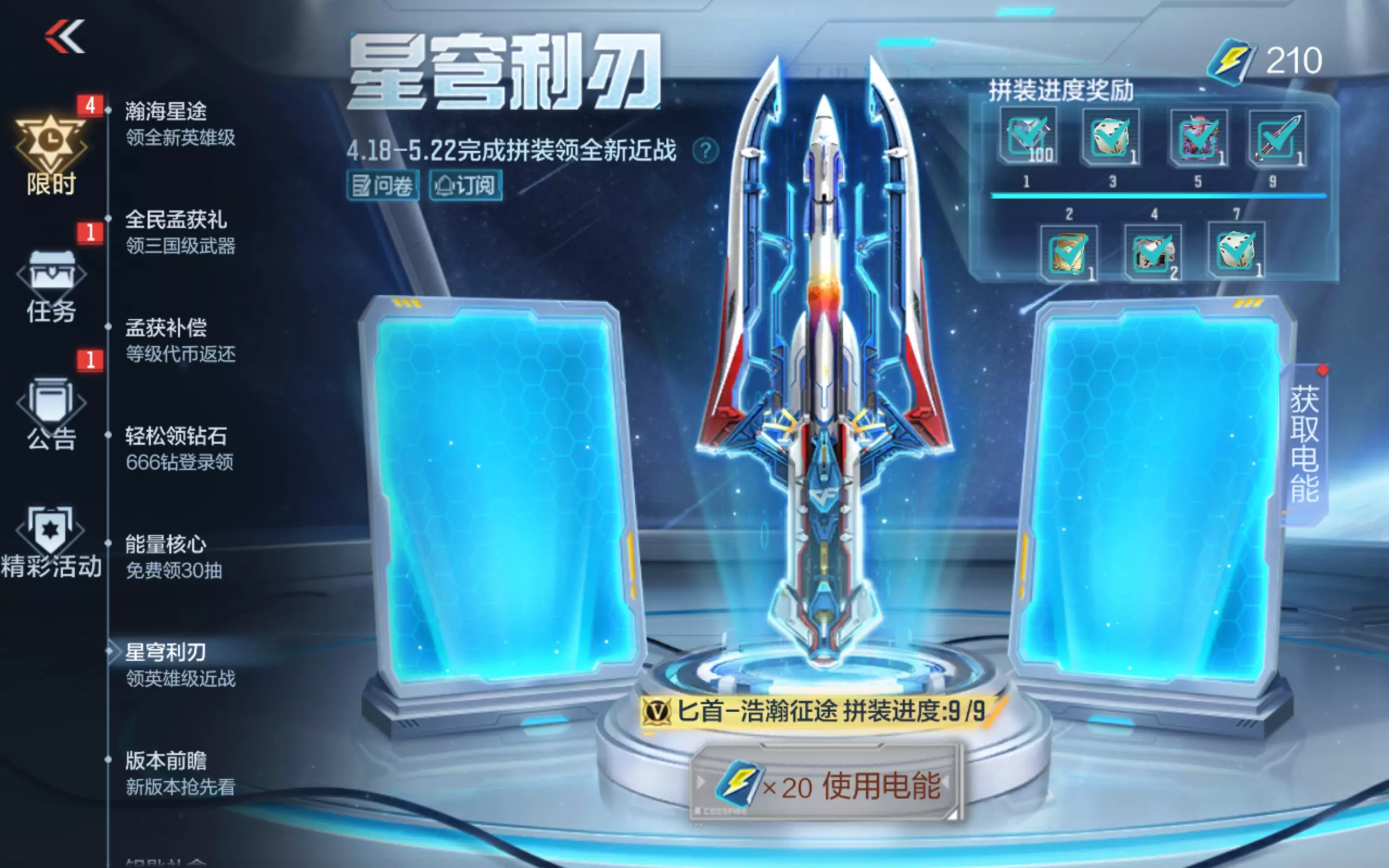 收集星穹电能拼装永久匕首-浩瀚征途的活动进入倒计时!还未完成的玩家,可通过每日任务快速收集电能,解锁无限战士玩偶、旧兵工厂十连抽券等道具,终极大奖即将收官!