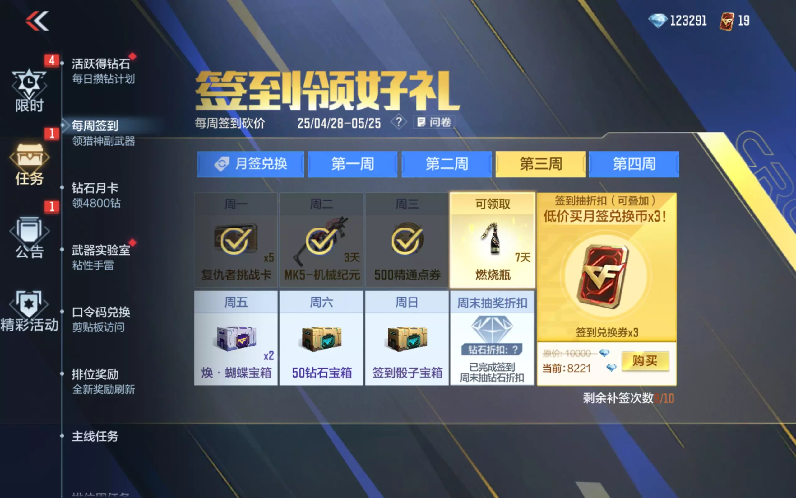 第三周签到奖励正在发放,登录可领取复仇者挑战卡 * 5、MK5-机械纪元(3 天)、燃烧瓶(7 天)+C4 工具钳(3 天)、焕·蝴蝶宝箱 * 2、50 钻石宝箱以及签到骰子宝箱!每日登录即可领取,记得定好闹钟打卡!