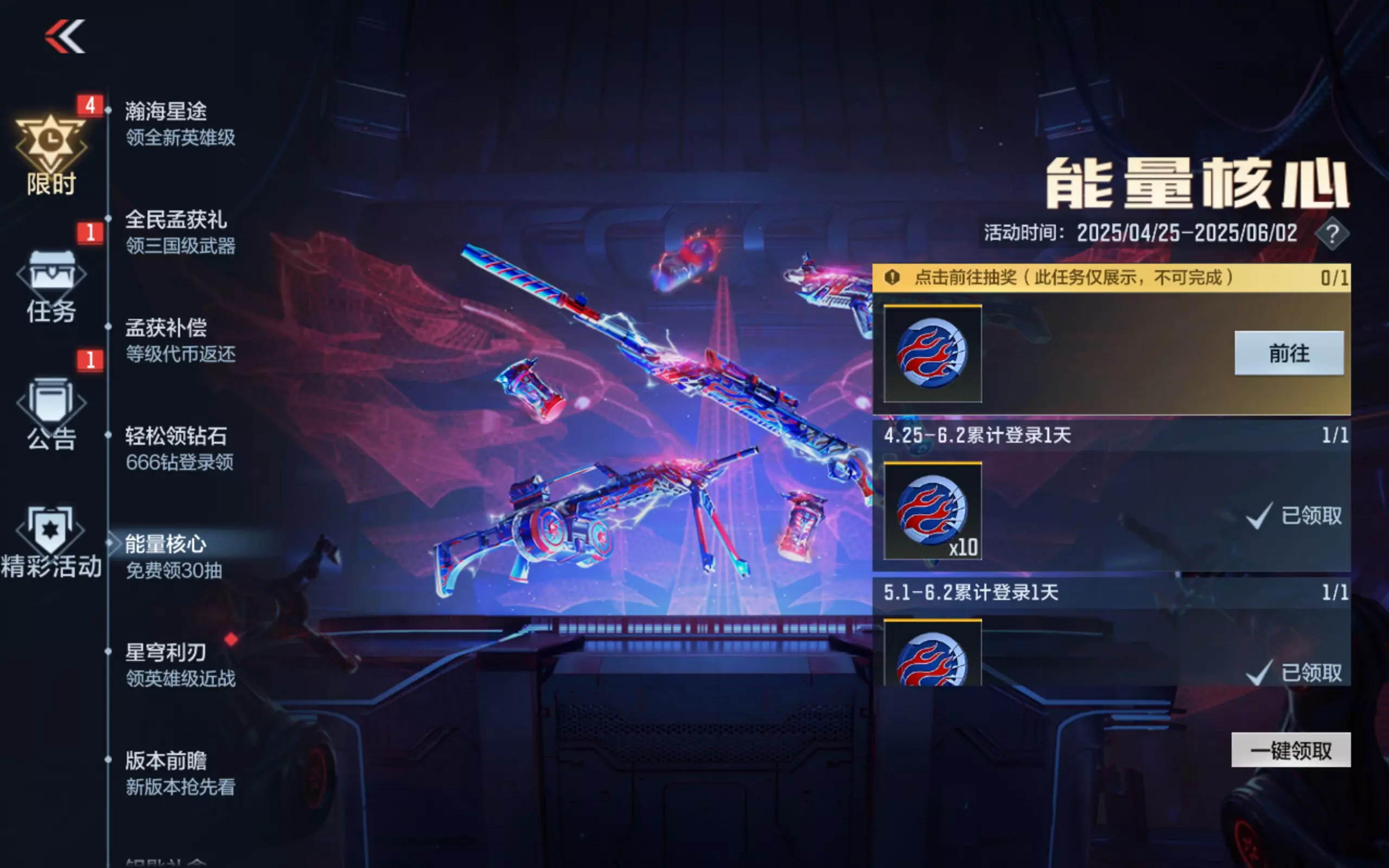 累计登录任务持续进行中,目前已解锁30 枚抽能量核心抽奖币,助力抽取黑骑士系列武器!特别提醒:5月1日开启的三次抽奖币领取通道仍有效,截至 6月2日,只要累计登录1次,即可领取这30 枚能量核心抽奖币。