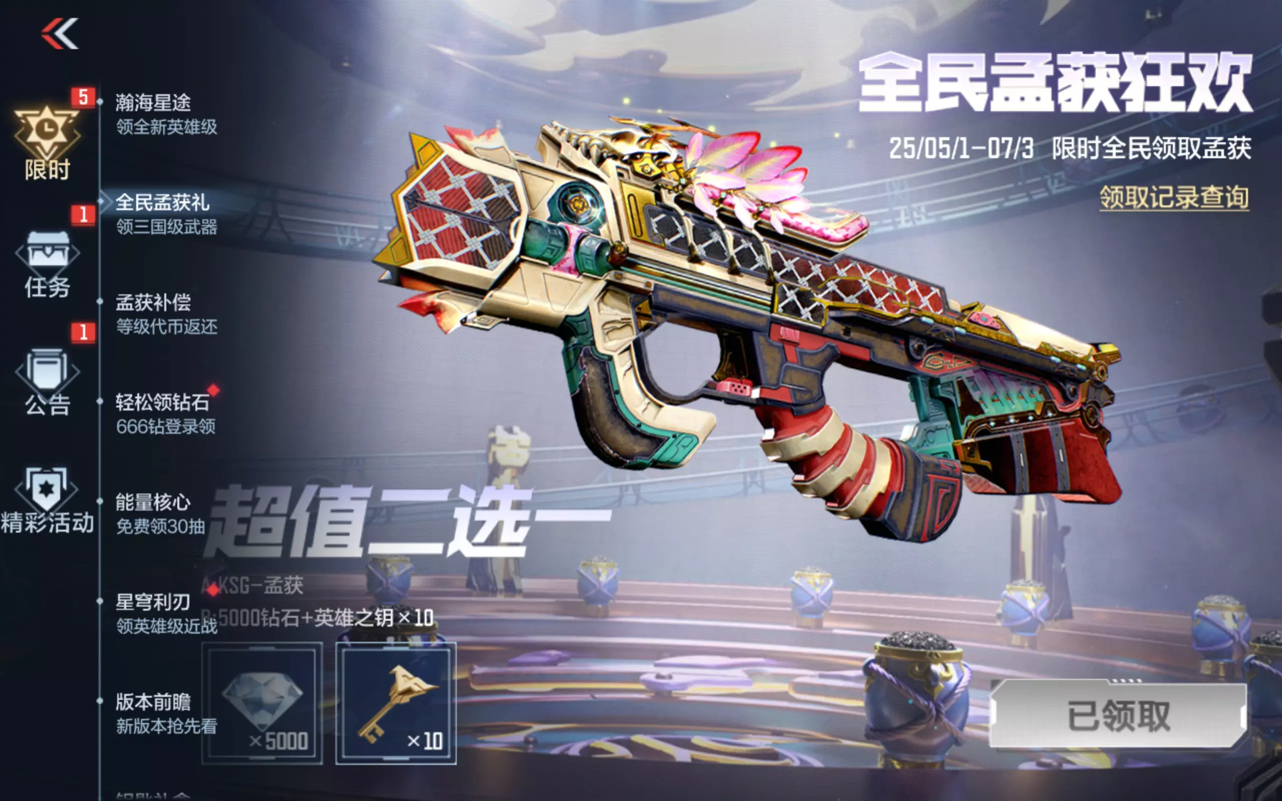 5 月 1 日当天登录的玩家已率先领走 KSG-孟获武器或 5000 钻石 + 10 把英雄之钥!目前活动仍在持续,即日起至 7 月 3 日,只要登录游戏即可任选一份豪礼。还未参与的玩家,现在上车还来得及!另外通过赏金令活动提前获得 KSG-孟获武器的玩家,记得来领取奖励,发放至游戏邮箱后,请及时查收。