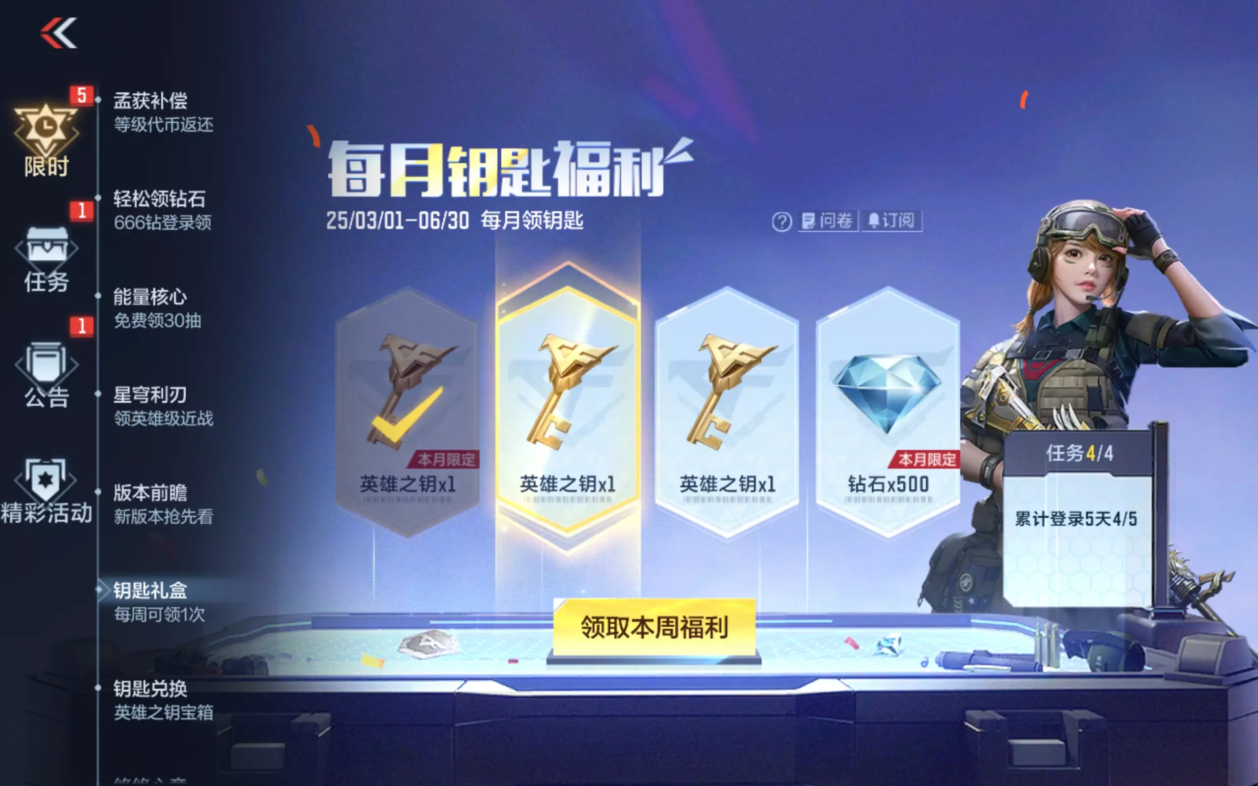每月必参与的钥匙福利活动正在进行中!完成每周任务,即可领取3 把英雄之钥 + 500 钻石。足足3把英雄之钥、500钻石,让你在商城中尽情选购心仪的道具。本周任务已刷新,上线随手完成,福利轻松积累!