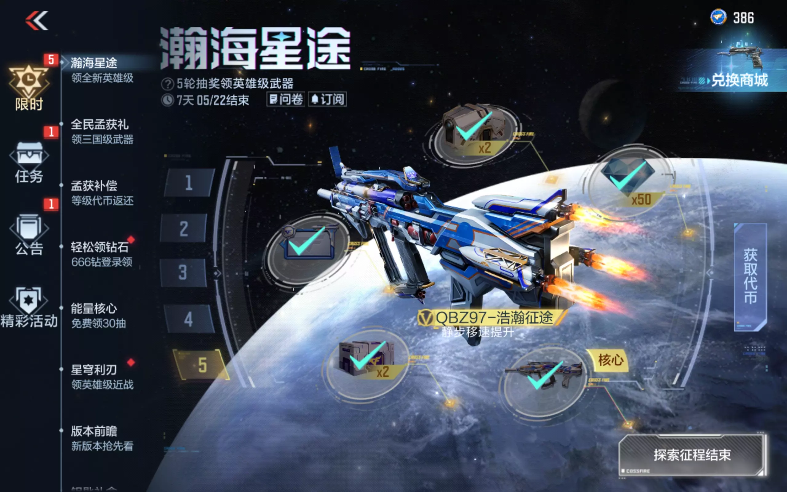 第五轮奖池已开启半个月有余!你的永久QBZ97-浩瀚征途领到了吗?星途币商城中,沙鹰-飞电-星空、SCAR-探星者等道具也在等待兑换。距离活动结束不足一周,还没攒够星途币的小伙伴要抓紧时间登录啦!