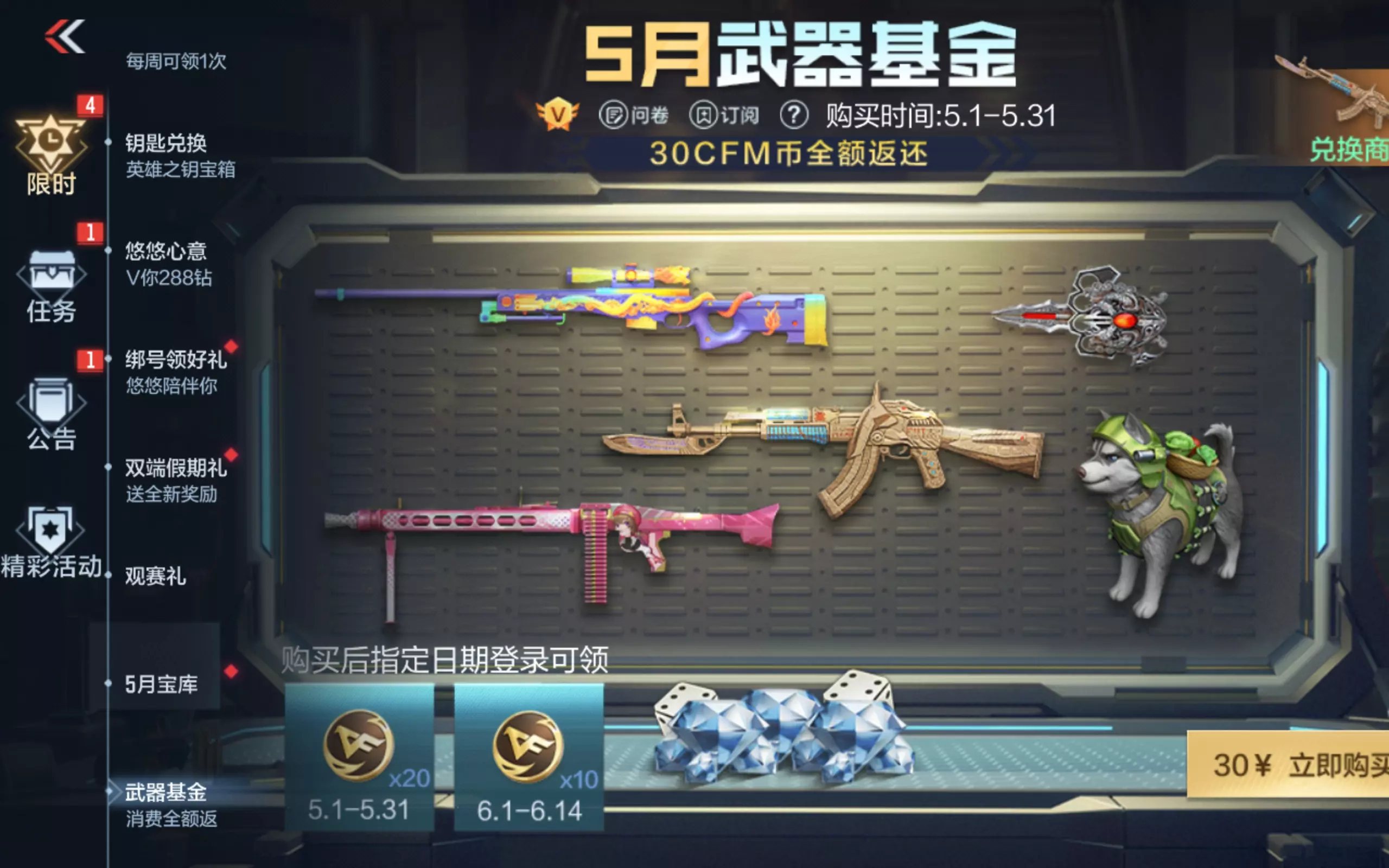 30 元解锁超值武器基金!购买后不仅能分阶段返还 30 CFM币,还可通过积分兑换 AWM-天龙-果冻超甜、MG3-晴光磊落等限定皮肤。目前兑换商城已开放,早购买早享受,武器外观党千万别错过!