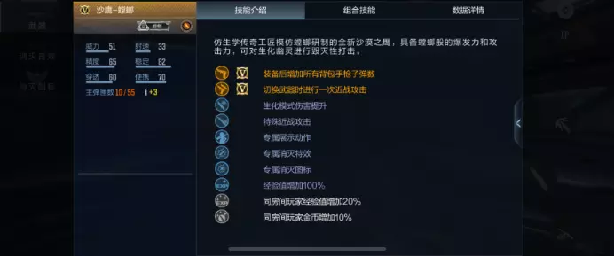 在武器属性方面,沙鹰-螳螂拥有沙鹰-修罗同样的近战攻击特性,除此之外,还拥有生化模式伤害提升的属性,以及专属展示动作、专属展示特效和专属消灭图标。