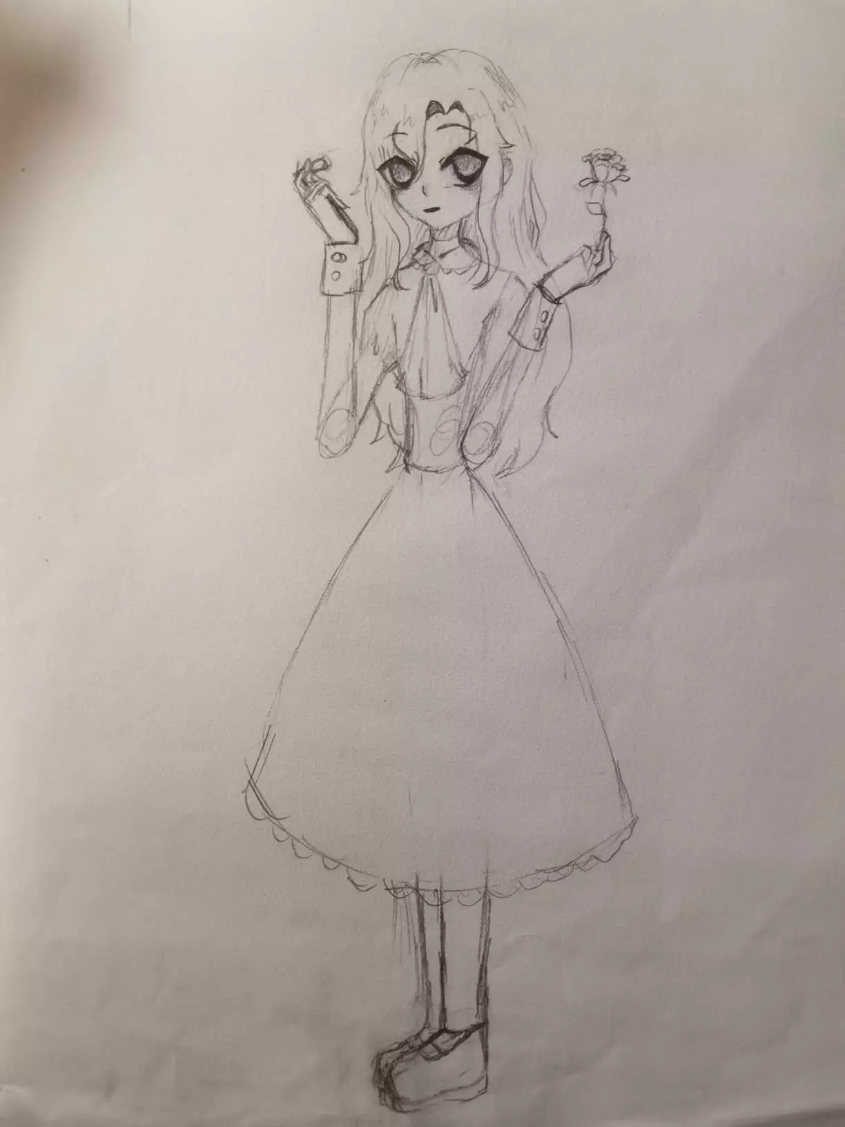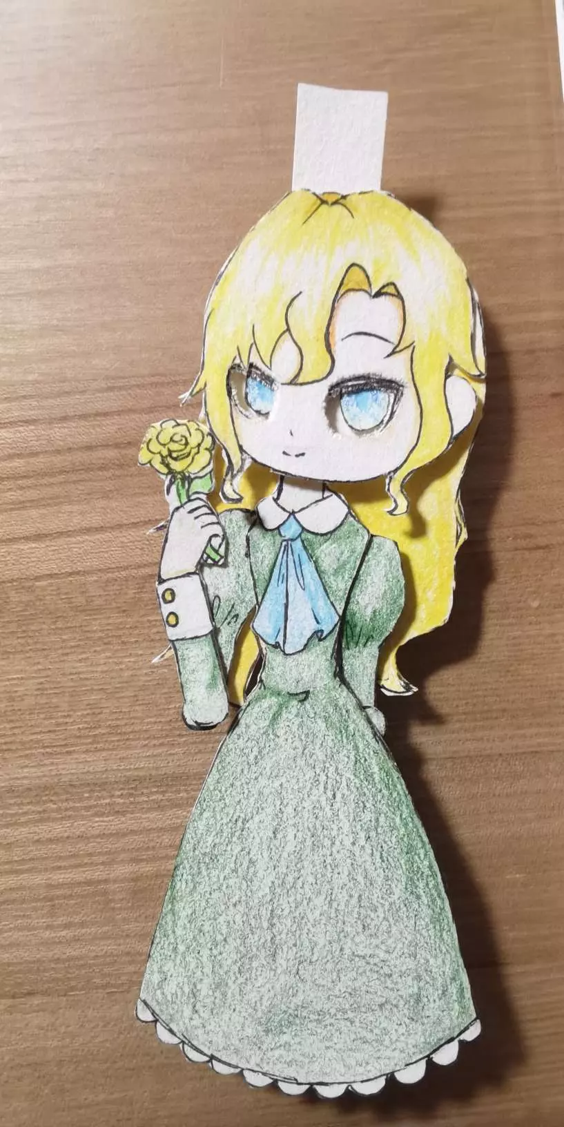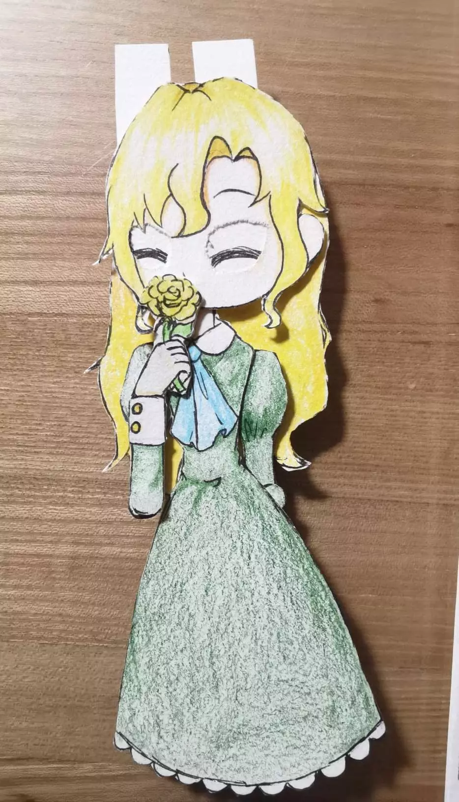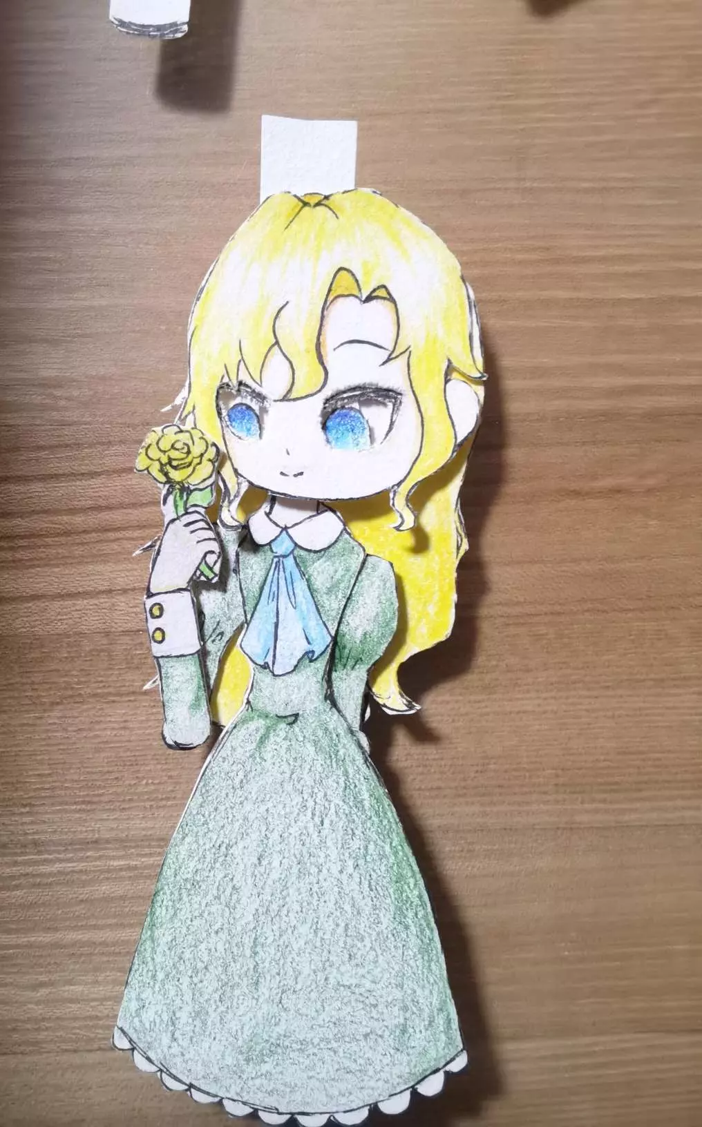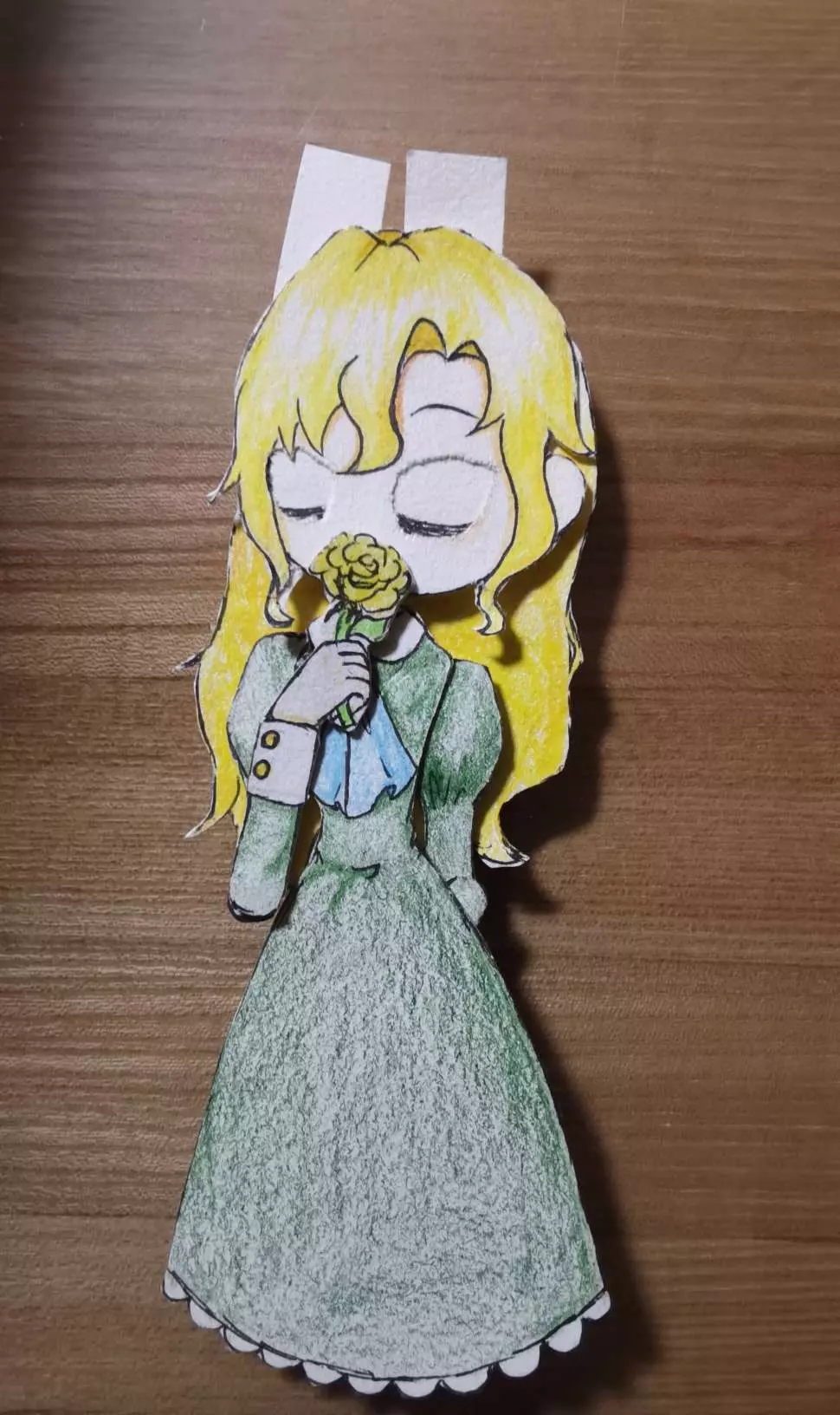 说实话,这个纸偶身体贴歪了,脖子错位,脸没粘上,眼皮上有脏东西,眼珠乱飞,花像简笔画,一只手歪七扭八只能背在身后,衣领和裙边蕾丝边没画,啥都不是啊啊啊