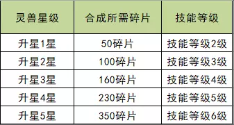 灵兽初始为0星,最高为5星,收集灵兽碎片可以提升对应灵兽的星级。灵兽星级越高,灵兽的基础属性与技能强度越高。